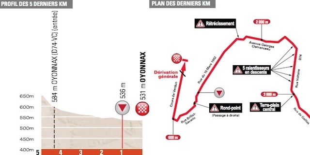 June 3 update: Stage 3 moves west into the Rhône-Alpes in the area north of Lyon. Wednesday's stage will have a similar finish (map and profile below) to Stage 2 and since there are fewer hills, there should be more sprinters (Nacer Bouhanni, Michael Matthews and Thor Hushovd) around to contest another sprint finish, this time in Tarare. Once again there are several sharp turns in the last kilometer. — Steve