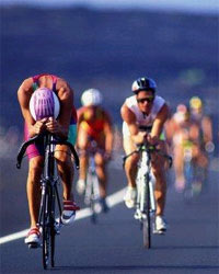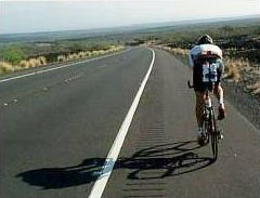 The bike leg of the Hawaiian Ironman, as for most triathlons, is a non-technical route... great for settling into the aerobars and hammering away and then occasionally standing to stretch the legs while going over the several rolling hills. None of the hills are steep except the approach to the turnaround point in Hawi, so riders can stay in the tuck position for hours and hours. Germany's Normann Stadler won the 2004 Hawaiian Ironman because of his strong bike leg. Stormin' Normann's bike leg split, 112 miles in 4:37:58 (24.2 mph), was 11 minutes faster than the next fastest athlete and gave him an impressive overall winning margin of 10 minutes. In preparation for the 2004 Hawaii Ironman, Stadler trained six weeks, 30 to 40 hours a week putting in about 25-30 km in the pool, 600-800 km on the bike and running 90-120 km. As you can appreciate, becoming the ultimate hammerhead is a full time job. Update: Stadler set a new bike course record of 4:18:23 (26 mph) on his way to winning the 2006 Ironman.