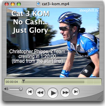 Cat 3 KOM winner (no cash just glory) - ZTeam's Chris Phipps crests in 1.20.00 (timed from the start), 5 minutes slower than the pros