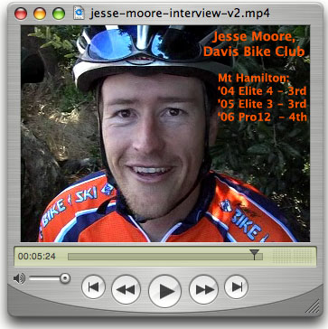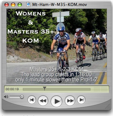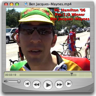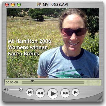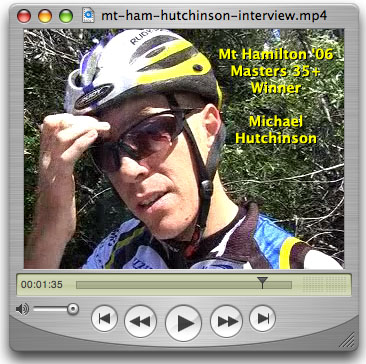 This report is by far our most extensive coverage of Norcal racing to date... probably more effort than it's worth. wink Thanks to my wife Rebecca, who I dropped off at the top of Mt Hamilton, for capturing the KOM footage before getting on her bike and cycling to the finish line. And thanks to Chris Hipp who followed the Pro-1-2 group and contributed significantly to this report. Unfortunately, the race officials were giving me hard time at the finish line... something about needing media credentials although there was no other media around. When I arrived at the finish line five minutes ahead of the pro-1-2 group I ditched my car in the pillions well past the finish line, but was vehemently told to move it. By the time I got back to the finish line I had just missed Ben Jacques-Maynes crossing the line but Charlotte Takemoto was nice enough to email her photos. Minutes later, I took hell for getting in the way while trying to find out what I missed. So after capturing the Cat 3 and Masters 35+ finishes I called it a day and decided to just hang out in the parking area and had a good time doing interviews with the winners. Between race coverage and interviews there is over 45 minutes of video () in this report. That's 45 minutes more than ESPN2, OLN and all local TV stations combined. The real media were off covering something more important this past weekend. Combined with more than the usual amount of photos, this report is much more extensive than it looks at first glance.