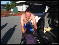 The usual zoo of riders in the parking area past the finish line
