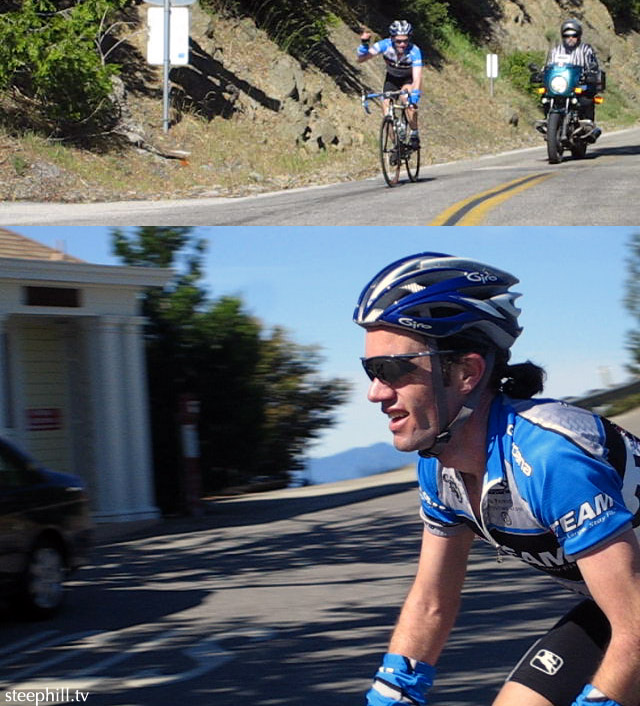 Cat 3 KOM winner (no cash just glory) - ZTeam's Chris Phipps crests in 1.20.00 (timed from the start), 5 minutes slower than the pros