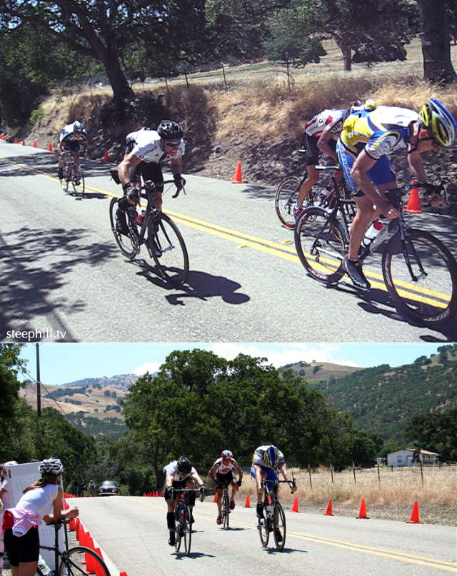 Masters 35 1-2-3 finish - Safeway's Dan Martin charges hard and almost beats Spine's Michael Hutchinson in a bike throw photo finish
