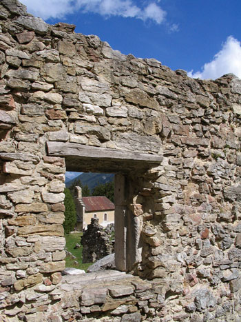 Looking through the ruins at the lone building that survived Calvaire de Valchevrière — the chapel.