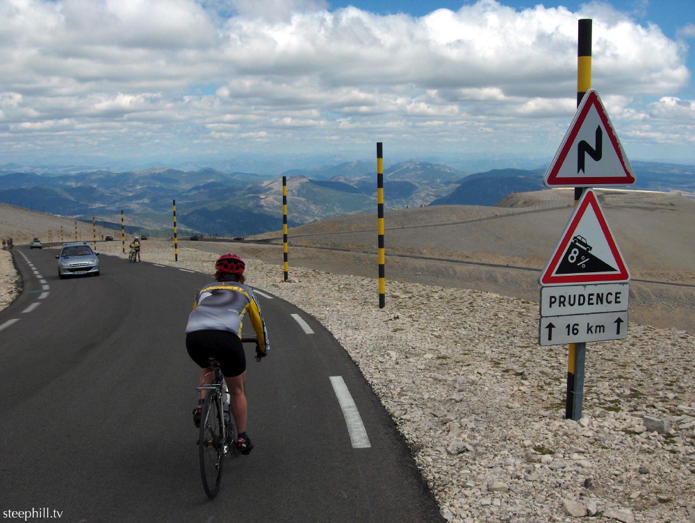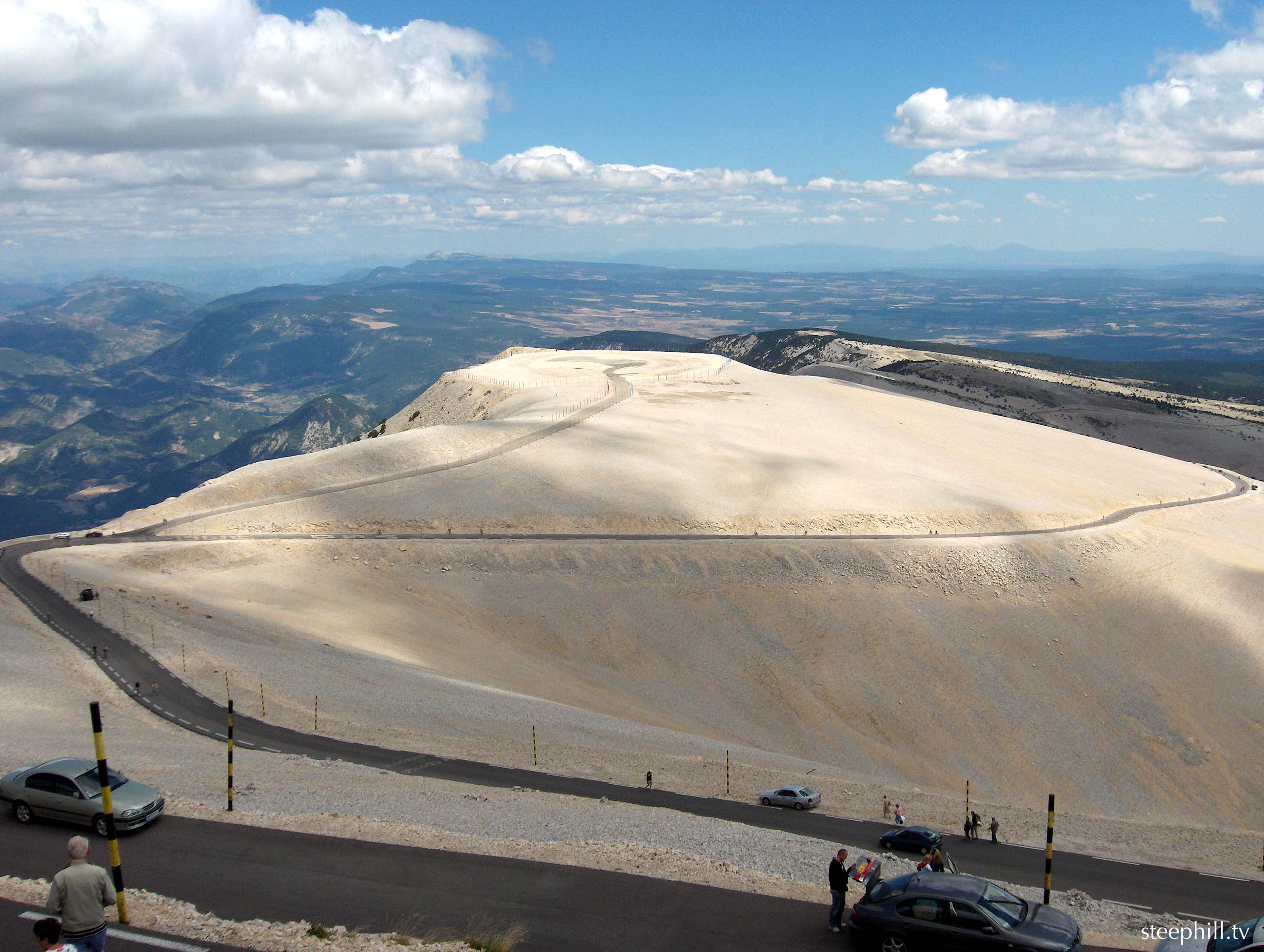 Looking down from the top. Ventoux looks snow-capped in mid-summer