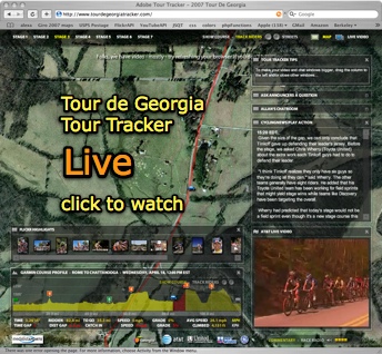 That left thousands of visitors to the official site and other sites (like this) receiving "Page Not Found" errors. (Since the profile, map and timetable links on this page access the official site, spectators couldn't access valuable stage information). I got hold of one of the organizers twenty-minutes ago, who was unaware of the problem, and urged him to undo the redirect which is what they have quickly done. Things seem to be back to normal. I've received permission to store the Stage PDFs on my site so the busy and not found errors will not happen again. In all, The Medalist Sports people do an amazing job handling logistics at these big races and this year's Tour de Georgia has been very difficult in many ways. By the way, just now the helicopter relay problems were fixed and the TourTracker (What is TourTracker?) with video and sound is working although there are still picture and audio breakups, but it's not too bad.