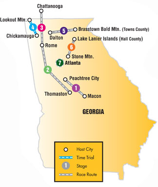 Expanding its stature from six to seven days, the Tour de Georgia will begin for the first time in its five-year history on a Monday. A full week of professional cycling and community festivals will embark on April 16 from Peachtree City, Ga, located just south of metro Atlanta, and work its way in a clockwise direction around the state of Georgia and include a return to Chattanooga, Tennessee. Highlights of the 600-mile route include a dramatic individual time trial to the top of Lookout Mountain, a return to the epic mountain-top finish on Brasstown Bald Mountain, a stage finish in Stone Mountain Park and a return to downtown Atlanta and Centennial Olympic Park as the Overall Finish.