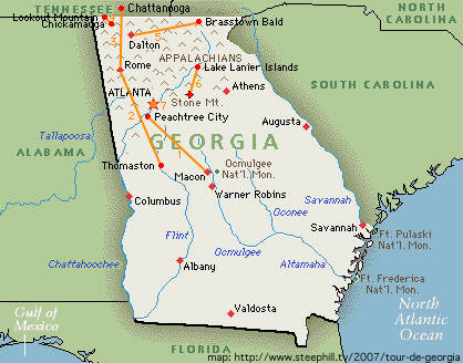 April 6 update: Here's nothing you don't already know if you've been following this page and its links, but it's good publicity from the venerable New York Times: Why Bicyclists Head to Georgia. I'll grant the writer kudos for elegance although the use of seven semi-colons in two sentences seems excessive: Over seven days, the tour moves through a landscape of sandstone ridgelines; gushing, rhododendron-lined creeks; blooming dogwoods; and green mountain vistas. Quirky distractions are inextricably linked to stops along the way: Peachtree City, where cars are banned and residents tool around on 85 miles of golf-cart trails; Dalton, home to more than 100 carpet outlet stores; Rock City, where visitors roam through a network of mountaintop caves adorned with glow-in-the-dark gnomes; Stone Mountain, where a laser light show illuminates the faces of Confederate leaders carved into a massive hunk of granite.