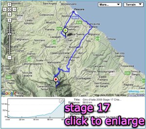 May 27 update: Today's short stage from Chieti to the finish on the Blockhaus climb promised fireworks. And fireworks, it delivered. Franco Pellizotti of Liquigas-Doimo attacked from the bottom of the Blockhaus and rode the entirety of the climb off the front alone. Pellizotti won the stage and moved up to third in the general classification. Denis Menchov of Rabobank remains the race leader, but Danilo Diluca of LPR Brakes chipped away at his lead. Diluca gained a small gap over Menchov in the sprint to the line and took the time bonus for third place. Behind the podium, the general classification reshuffled as today's difficult climb shattered the race into small groups spread out over the slopes of the mountain... Read more of Gavia's Stage 17 commentary and check out the Stage 18 Preview