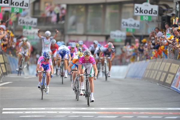 May 11 update: The narrow serpentine roads of the run-in to Valdobbiadene made for hectic racing in today's stage 3. Liquigas set a high pace, that left many riders scrambling out the back. Inside 20 kilometers to ride, Thomas Voeckler made a short-lived dash for freedom. Ex-rider and Eurosport commentator Sean Kelly did not approve, calling the move a wasted effort. Kelly proved correct, as the field brought Voeckler back into the fold. With approximately 10 kilometers to ride, a crash brought the bunch to a complete halt. At the time, small break, which included general classification rider Levi Leipheimer, was up the road, and looked ready to run away with the stage. Some quick work from Liquigas and LPR Brakes soon brought the field back together, and a sprint looked increasingly likely. Caught behind the split, Mark Cavendish never made it back to the main field, out of the sprint and the race lead...
