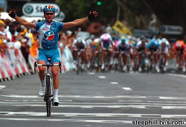 Stage 5 Results Post Stage AnalysisFirst Win for Voeckler A solo winner today, as Thomas Voeckler of Bbox Bouygues Telecom celebrated his first ever stage victory at the Tour de France. Voeckler joined an early break of six riders who spent 173 kilometers off the front of the main field. The French rider is a familiar face in the breakaways, but never before has his agressiveness paid off as well as it did today. Mikhail Ignatiev, who also rode the breakaway, held on for second, while Mark Cavendish won the sprint for third. In the crosswinds along the coast, Astana rode hard on the front and temporarily split the bunch. Despite their efforts, the general classification remains unchanged today, with the exception of Rabobank’s Robert Gesink, who leaves the Tour today after a crash. Fabian Cancellara wears the Yellow Jersey for another day tomorrow, as the Tour counts down to its first mountain stage in two day’s time. The Story After 23 kilometers of racing, six riders rode together at the front: Thomas Voeckler of Bbox Bouygues, Anthony Geslin and Yauheni Hutarovich of Français des Jeux, Marcin Sapa of Lampre-Ngc, Mikhail Ignatiev of Katusha, and Albert Timmer of Skil-Shimano. The main field proved rather uninterested today, and the break soon built up an advantage of over 8 minutes. Ignatiev became the race leader on the road. In a game of chicken with Astana, Saxo Bank sat on their hands, content to let Ignatiev run out the clock. Unwilling to let the break have all the fun, Columbia-HTC soon went to work on the front, and by kilometer 88, the break had come back to a more reasonable 3:35. With 77 kilometer to race, the Côte des Treilles piqued the interest of Astana and Saxo Bank, who began to work on the front. The six riders in the break continued to hold their advantage as Anthony Geslin of Français des Jeux took the points at the summit. As the bunch hit the coast near Port-Leucate, the winds made for nervy racing today and Astana rode hard at the front through the crosswinds. Around 50 kilometers to go, the main field split in two parts. Of the favorites, only Denis Menchov missed the split, another bad moment in a less than stellar Tour so far for the Russian. Tom Boonen suffered two flat tires, and also languished for a time in the second group. The gap between the chase and the Yellow Jersey group hovered around a minute. Robert Gesink, who crashed hard on the descent from the Côte de Treilles, dangled just off the back of the chase group in a desperate but doomed effort to stay on terms. Up the road, the break clung to its advantage which dropped steadily thanks to the hard riding by Astana. With 20 kilometers to go, the wind shifted again, this time to a headwind. The main field reformed after the chase group’s efforts proved successful. With Astana retiring from the front of the Yellow Jersey group, the gap to the breakaway began to increase. Ordinarily, a head wind gives an advantage to the main field over the escape, because the main field has more legs to do the work. But today, many of those legs proved tired after yesterday’s difficult team time trial. Despite the efforts of Columbia-HTC, Garmin-Slipstream, Cervélo TestTeam, and Agritubel, the break continued to hold its advantage as they approached the finish. With 6 kilometers to go, Mikhail Ignatiev of Katusha made the first move from the break. Hutarovich, Timmer, and Voeckler covered, and it was four together. As the break approached a roundabout, Voeckler jumped hard, hard enough to open a gap on Ignatiev, Hutarovich, and Timmer. The three hesitated. Head down Voeckler rode, and soon had just under 10 seconds over the following three. Passing through the roundabout with 2.5 kilometers to go, Voeckler continued to hold his advantage, though Timmer made a late bid to bridge. Too late for Timmer, as it turned out. Inside the final kilometer, Timmer still chased desperately, as Voeckler approached the finish. In the background, the main field came up quickly, but not quickly enough to interrupt Voeckler’s victory celebration. Thomas Voeckler won his first ever stage win today, five years to the day after he took his first Yellow Jersey. The French rider, who is so often on the attack, crossed the line kissing his wedding ring, and dedicated his win to his wife and son. In his typically modest way, Voeckler explained, “Winning a big Tour in cycling is never going to happen for me, so I try to win stages when I can. I’m very happy for my team and what we’ve achieved and I hope we can come back next year and do it again.” Voeckler’s Bbox Bouygues Telecom team is currently in search of a sponsor. Today marks Voeckler’s most important victory so far in his career, which includes a French National Championship on the road, and a win at the difficult one-day race GP de Plouay. His sports director, Jean-René Bernadeau, who celebrated his birthday today, exclaimed, “His is not like the rest of the world, Thomas!” “He is strong, very sain, very pro. He won brilliantly, intelligently,” said the joyous Bernadeau. Happy Birthday, Jean-René! Behind Voeckler, Ignatiev held off the main field to take second on the stage, while Cavendish won the bunch sprint for third ahead of Tyler Farrar. Fabian Cancellara finished safely in the field and will wear the Yellow Jersey for another day. Lance Armstrong sits second at same time, while Alberto Contador is third at 19 seconds. As for Robert Gesink, he finished the stage 9:35 after Thomas Voeckler. His Rabobank team-mate Grischa Niermann escorted him to the finish in what was surely a long and torturous ride. According to De Telegraaf, Gesink has a fracture in his left wrist and a dislocated shoulder. If all goes well, the team has said he will likely ride the Vuelta a España, which starts this year in the Netherlands. After the stage, Cancellara called the stage nervous with its shifty winds and small roads. A stage like this is “hard for the head,