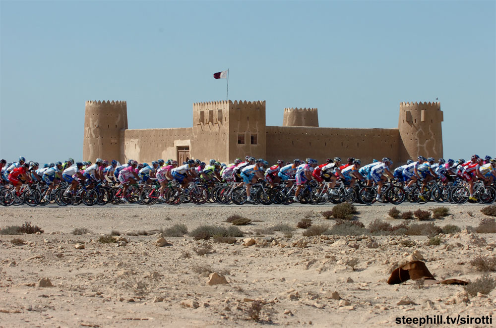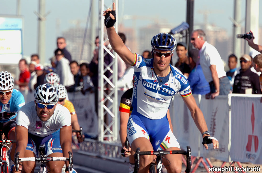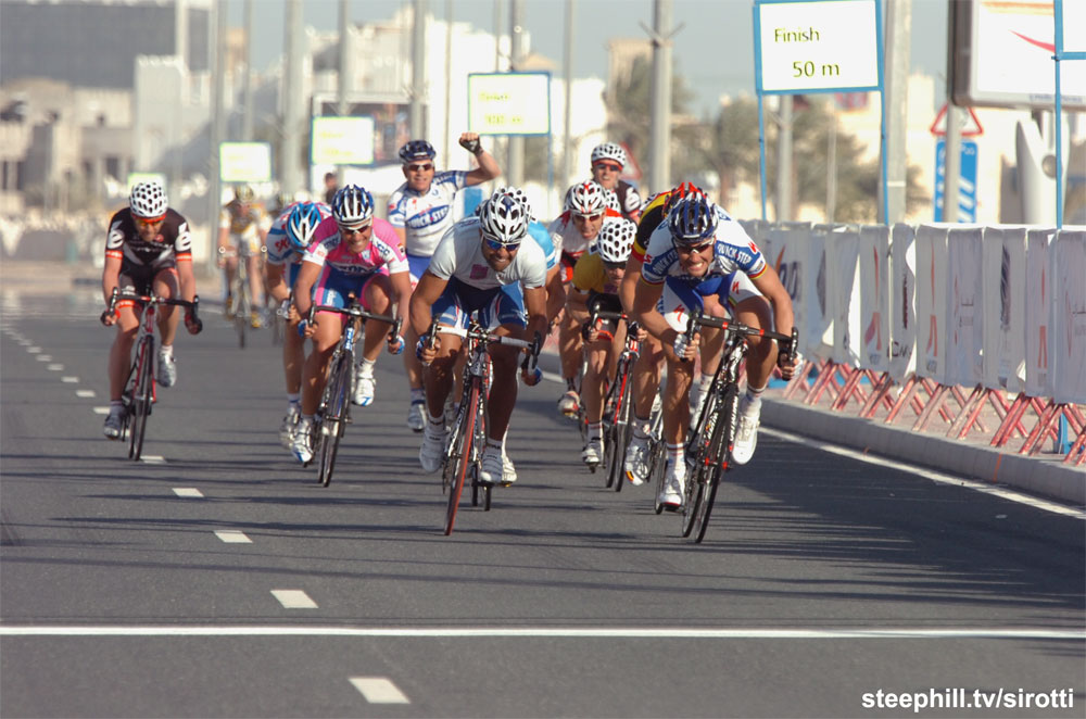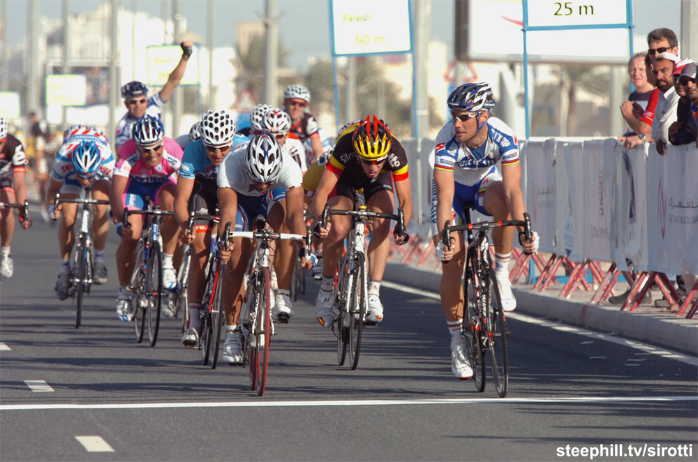 The first sprint finish of this year's race came down to Danilo Napolitano (Ita) Katusha vs. Tom Boonen (Bel) Quick Step. Note the strong crosswind.