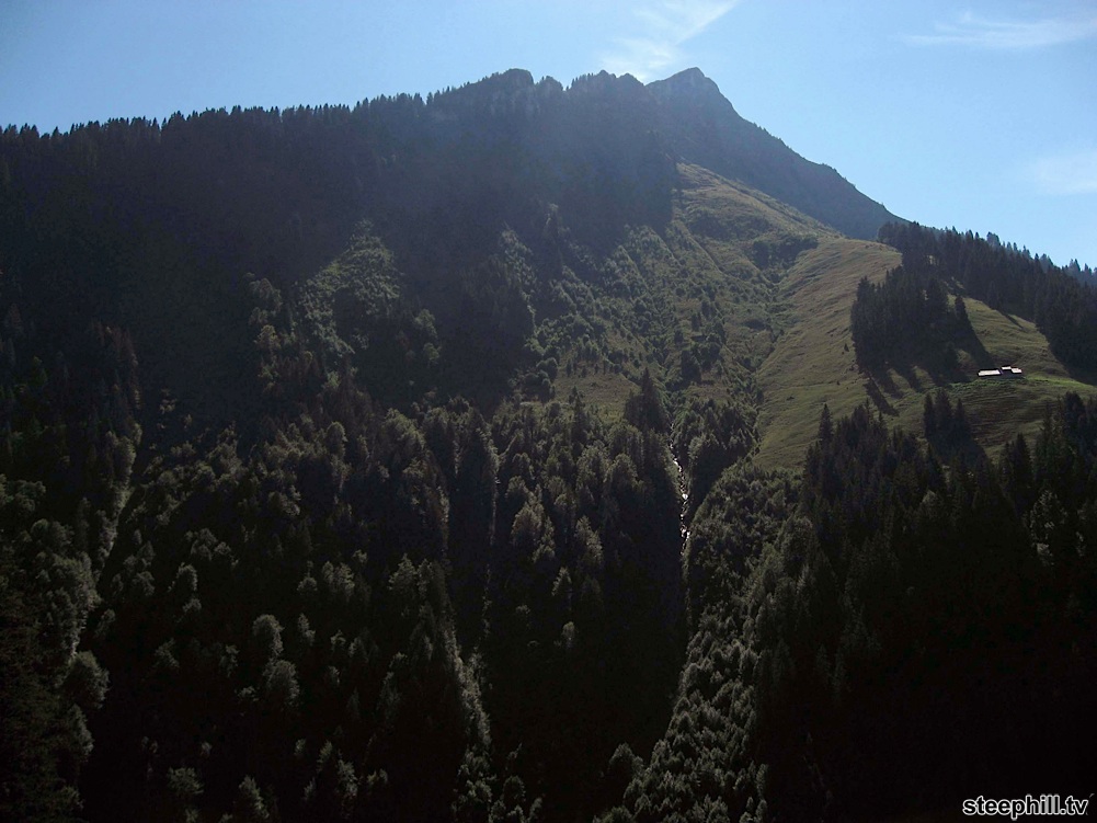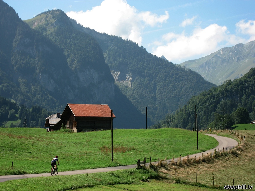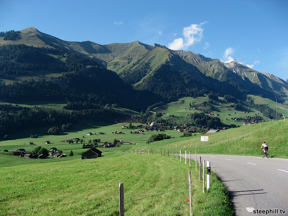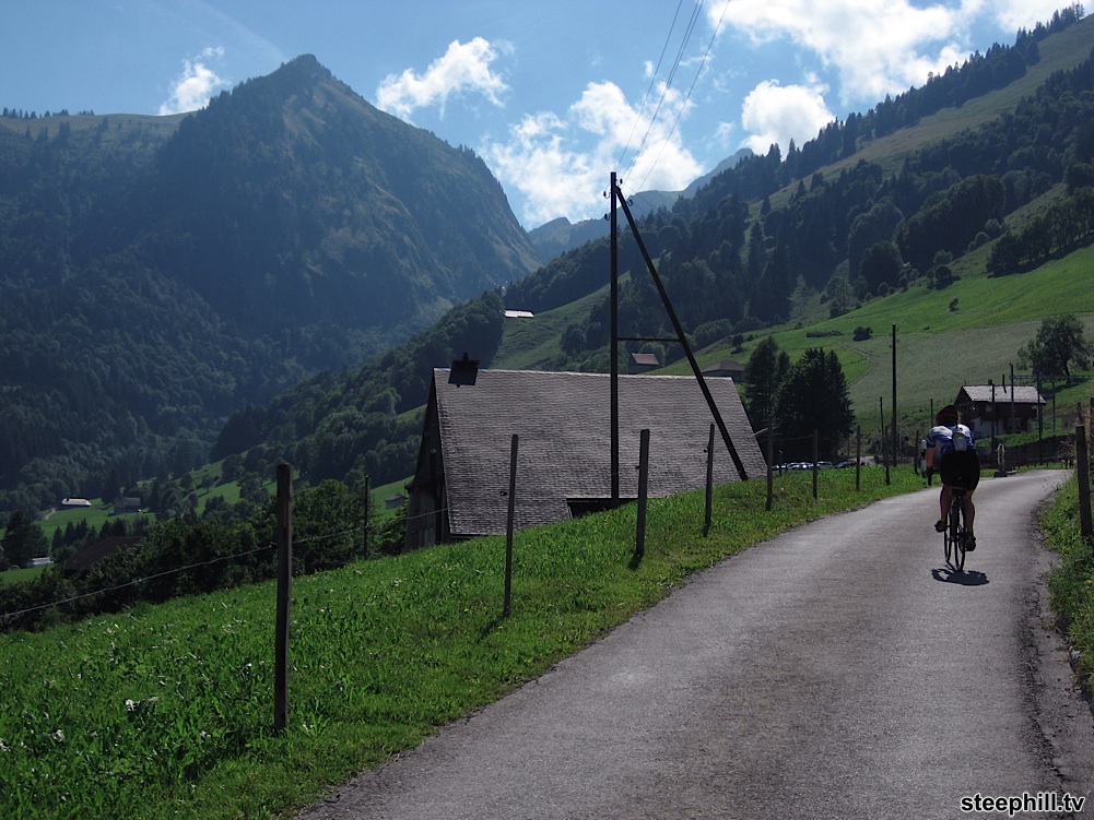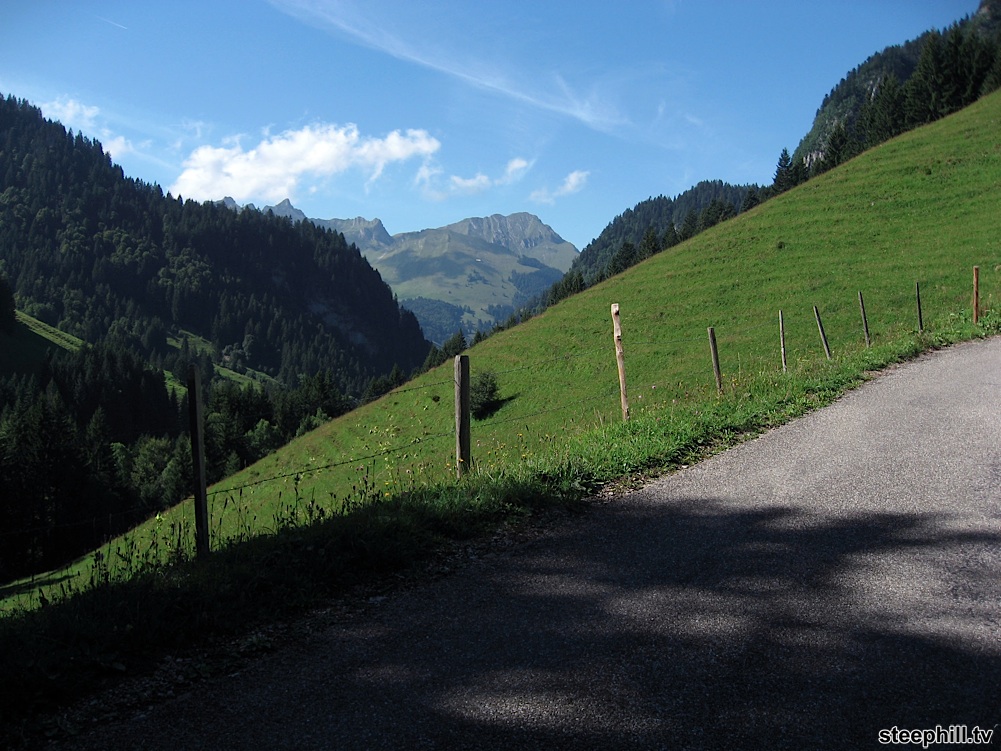 15 minutes after turning off of the main valley road at Montbovon (km 9), the scenery started to open up before us on a narrow climb.