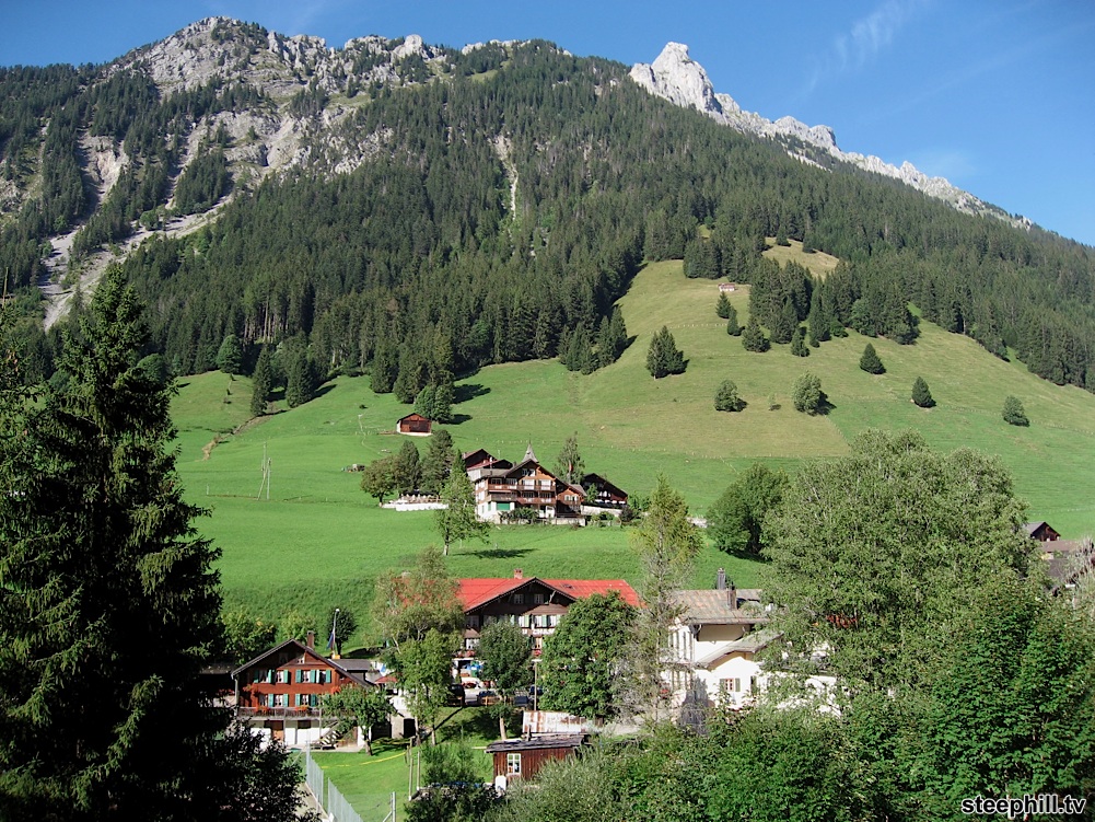 After a day of driving, I studied my collection of maps and felt the 40 km loop west of Chateau d'Oex east of Lake Geneva might be the ride we needed. Other than observing the area from the valley on the drive in, we weren't sure what to expect so this picturesque loop was a pleasant surprise. This ride, to us, was quintessential Switzerland; the lush green hillsides dotted with Swiss chalets, quiet narrow twisty roads and majestic mountains. All in just 40 kilometers so this ride is great value for the mileage. Scroll down and I'll continue the story with some big photos. — Steve