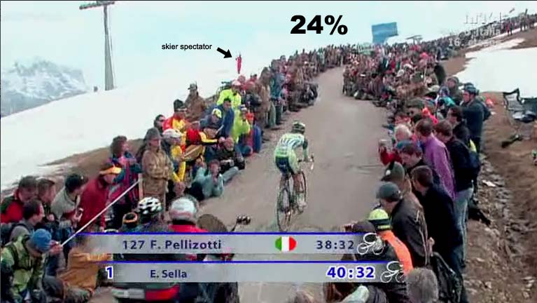 Stage 20 alert: There could be trouble ahead for Stage 20 with snow in the forecast for Passo di Gavia on Saturday. Apparently, there is already 4 to 6 meters by the road side. Climbs for an alternate route may include Trivigno (14.5km/8.9%), Aprica (6.2km/7.4%), Mortirolo from Grosio (14.8km/8.3%), then Tonale. More to come. — Steve