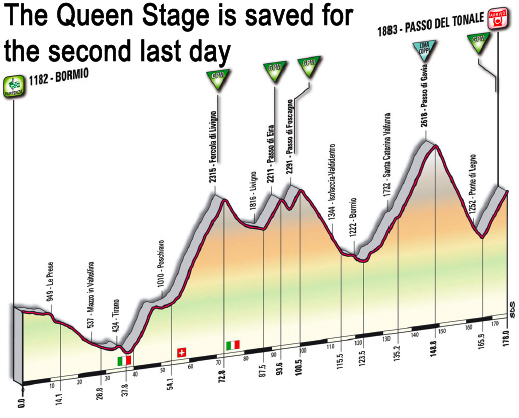 After a rest day, the climbing continues with the time trial on the Plan de Corones, which with its unpaved upper kilometers. Franco Pellizotti won the first edition of the Plan de Corones test, and this year’s Giro uses the same course running from San Vigilio di Marebbe to the 2273 meter mark on the Plan de Corones. The maximum gradient is 24% on the Plan de Corones and it resembles a mountain bike course more than a traditional road stage. The climbing continues the following day with a stage running between Brunico and Pejo Terme, which includes the 18.9 kilometer Passo delle Palade and finishes at Peio Terme, 1393 meters above sea level. The Giro then gives the general classification riders a rest with a flat stage between Levico Terme near the Swiss border and Brescia, but this stage offers just a short respite before the mountains begin again.