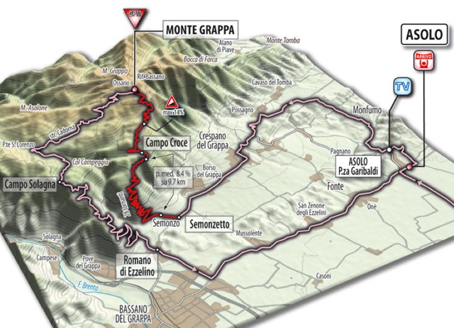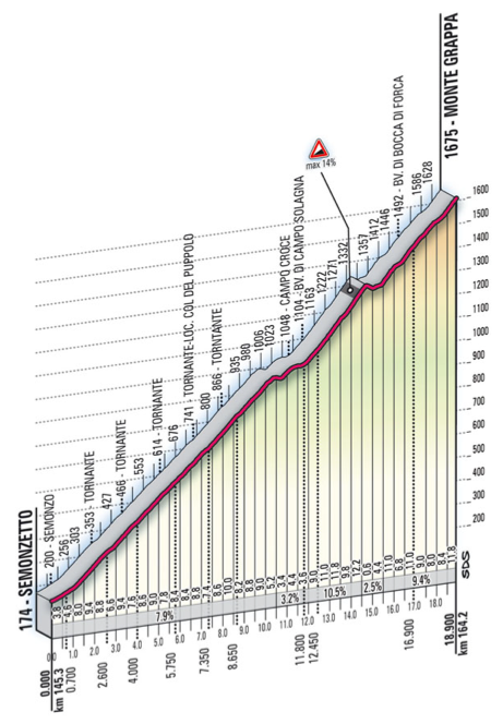 May 22 update: Stage 14 is a stage of contrasts; it is flat except one big climb, Monte Grappa, near the end before the technical descent back to Asolo where there is a flat finish. The historic Monte Grappa is 19 km long with an average grade of 7.9% - the biggest test, so far, in this year's race. — Steve