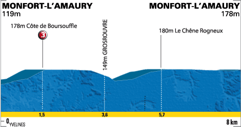 Stage 1: Montfort-l’Amaury - Montfort-L’Amaury. The Race to the Sun begins with a prologue in Montfort-l’Amaury. No, Paris-Nice does not start in Paris, but instead in Montfort-l’Amaury, which lies 20 kilometers southwest of the French capital. Not far from Versailles, the city dates from the 9th century, and was the original stronghold of the Comtes de Montfort. Farms and forest lands surround the city, and the terrain is rolling, uninterrupted by any significant hills. The prologue follows a mostly flat 8 kilometer course. The stage starts with a bit of a climb, and after the opening kilometer, the riders face the Côte de Boursouffle. They will have nothing to fear, here, as the climb rises only 59 meters in .6 kilometers with an average gradient of 6%. The Côte de Boursouffle carries a category 3 rating and offers the chance for an ambitious rider to pull on the Mountains Jersey at the end of the day. Following the climb, the course rolls along for just over a kilometer then descends gently. Another gradual climb follows. The non-categorized Le Chêne Rogneux tops out at 180 meters, then it’s just over 2 kilometers of flat racing to the finish. No corners mar the final 2 kilometers and it’s a straight shot to the finish. It will be a fast opening day at Paris-Nice, and the stage should show us who came to Paris-Nice with big ambitions. Last year, Alberto Contador opened his account with a win in the prologue. The two-time Tour winner beat crono specialist Bradley Wiggins by 7 seconds to take the first leader’s jersey of the race. Eventual overall winner Luis Leon Sánchez finished third. In these early season races, the specialists do not always win as riders who are chasing a first win show up with screaming good form. Riders to watch in this prologue include last year’s stage winner Alberto Contador, who returns for this edition of Paris-Nice. Alejandro Valverde will lead Caisse d’Epargne in place of last year’s overall winner Luis Leon Sánchez, and Valverde who won the 2009 Vuelta a España is no slouch at short efforts against the watch like this one. Tony Martin, who finished fourth in the 2009 prologue at the Race to the Sun is meanwhile recovering from tendonitis in his knee, so may fall short of last year’s fab performance. Martin’s team-mate at HTC-Columbia Marco Pinotti might be the better pick for this prologue. Christian Vandevelde will lead Garmin-Slipstream, and while his season objectives come much later this year, he can roll a nice time trial on his day. Likewise for Roman Kreuziger of Liquigas-Doimo who is aiming for a high finish at the Tour de France in July. Kreuziger is showing some nice early season form as he recently won the overall at the Giro di Sardegna in Italy. Last, but certainly not least, Levi Leipheimer has a knack for the crono and will ride this Paris-Nice for the new American team RadioShack. Count Leipheimer among the favorites for a good ride in Montfort-l’Amaury. — Gavia (updates to this preview will be made during the race and especially the day before the stage with current analysis)<-->