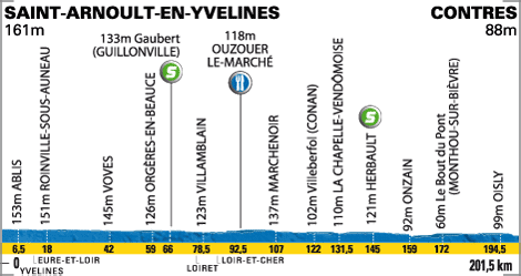 Stage 2: Saint-Arnoult-en-Yvelines - Contres. This 201.5 kilometer stage between Saint-Arnoult-en-Yvelines and Contres offers the fast-men their first opportunity to chase stage victory at this year's Paris-Nice. Saint-Arnoult-en-Yvelines has never before hosted a Paris-Nice stage, but it has provided the start for Paris-Tours on 16 occasions. The stage runs almost directly south over flat terrain across the Plain de Beauce. Wind is common across the flat lands of the Plain de Beauce, so there is always the possibility that crosswinds will split the field. Though the riders will have no time for sight-seeing, the stage passes the famous château de Chaumont sur Loire. Contres, a town east of Tours and just south of Blois, will host the finish. No categorized climbs decorate the stage profile. Indeed, the stage runs slightly downhill all the way, losing around 60 meters in elevation between the start and finish. There's no excuse for the riders to dilly-dally. Two intermediate sprints enliven the proceedings and the time bonuses could bring a change in the race lead by day’s end. The towns of Gaubert and Herbault host the sprints, which come at kilometers 66 and 145. The stage should end in a sprint. A right turn announces the sprint at 600 meters to go, then it’s a straight line to the finish. This week, the sprint field divides between Paris-Nice and Tirreno-Adriatico, with the flatter Italian race typically proving the more popular. Still, the final kilometer should see its share of hijinx during this Paris-Nice. André Greipel has already proved his early-season speed this year, and we can expect to see him at the front with his powerful HTC-Columbia team. HTC-Columbia, who also ably support Mark Cavendish in the sprints, expert at the lead-out business. Heinrich Haussler of Cervélo TestTeam will also ride Paris-Nice. Of late, Haussler has found victory elusive as he has scored a string of seconds and thirds. The master of the near-miss, Haussler no doubt is hoping his luck will change. Greg Henderson will represent Team Sky in the final kilometer. Henderson transferred to Sky after riding in the Cavendish-Greipel trains at HTC-Columbia. Given the chance to race for himself, Henderson scored a sprint win of his own last season, and in January, he took two stage wins at the Tour Down Under. Borut Božič of Vacansoleil won two stages at the Etoile des Bessèges already this year, and finished second last year at Paris-Tours after making it to the line in a three-up break with Philippe Gilbert and Tom Boonen. Français des Jeux will be hoping that their sprinter Yahueni Hutarovich can match his recent successes at the Tour Mediterréen where he won two stages. — Gavia (updates to this preview will be made during the race and especially the day before the stage with current analysis)<-->