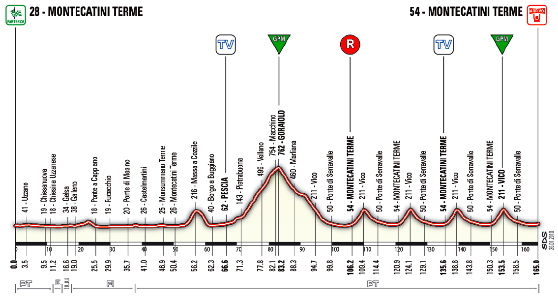 We'll then return to the start town, Montecatini Terme, where we'll do four 14 km circuits that include a 211m climb each pass. After exiting the circuits, the riders will have a gradual downhill grade and flat run for the final 12 km and then a slight uphill finish. There is a 20% chance of snow for Montecatini Terme on Thursday so this stage could be even more miserable and treacherous than stage 1. — Steve