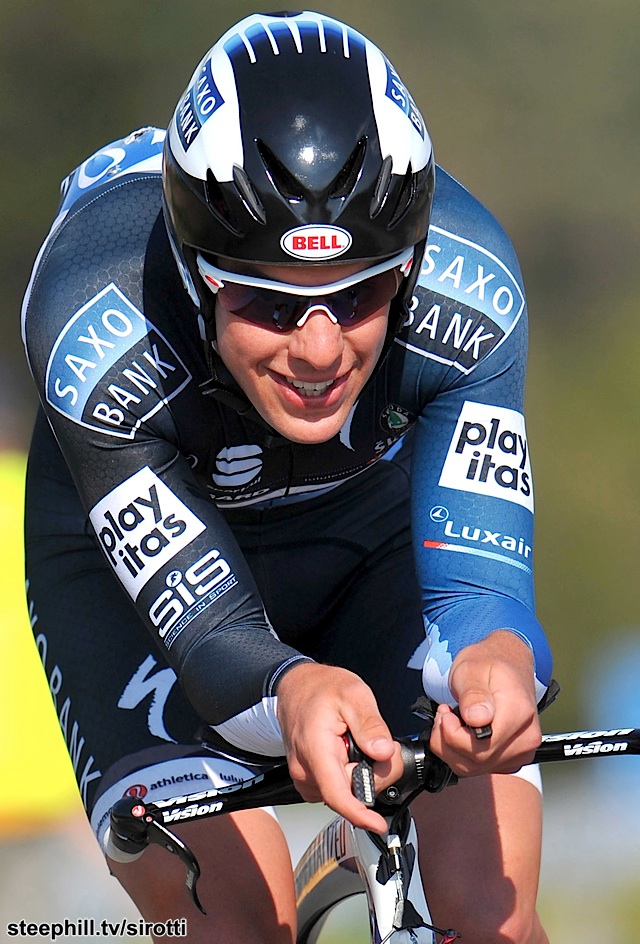 Stage 3 23.4 km ITT results: 1 Richie Porte (Saxo Bank) 30:54 (45.4 km/h) 2 Alejandro Valverde (Caisse d'Epargne) 31:20 + 0:26 3 Vladimir Karperts (Katusha) 31:21 + 0:27 4 Michael Rogers (Team HTC-Columbia) 31:23 + 0:29 5 Denis Menchov (Rabobank) 31:25 + 0:31 6 Artem Ovechkin (Katusha) 31:25 + 0:31 7 Janez Brajkovic 31:30 + 0:36 8 Christophe Moreau (Caisse d'Epargne) 31:45 + 0:51 9 Simon Spilak (Lampre) 31:48 + 0:54 10 Tiago Machado (RadioShack) 31:53 + 0:59 ... 19 Marco Pinotti (Team HTC - Columbia) 32:16 + 1:22 ... 30 Peter Sagan (Liquigas) 32:29 + 1:35 General classification after stage 3 1 Michael Rogers (Team HTC-Columbia) 2 Alejandro Valverde (Caisse d'Epargne) + 0:02 3 Vladimir Karperts (Katusha) + 0:06 4 Artem Ovechkin (Katusha) + 0:07 5 Denis Menchov (Rabobank) + 0:09 6 Janez Brajkovic (RadioShack) + 0:16 7 Richie Porte (Saxo Bank) + 0:18 8 Christophe Moreau (Caisse d'Epargne) + 0:24 9 Simon Spilak (Lampre) + 0:35 10 Tiago Machado (RadioShack) + 0:39