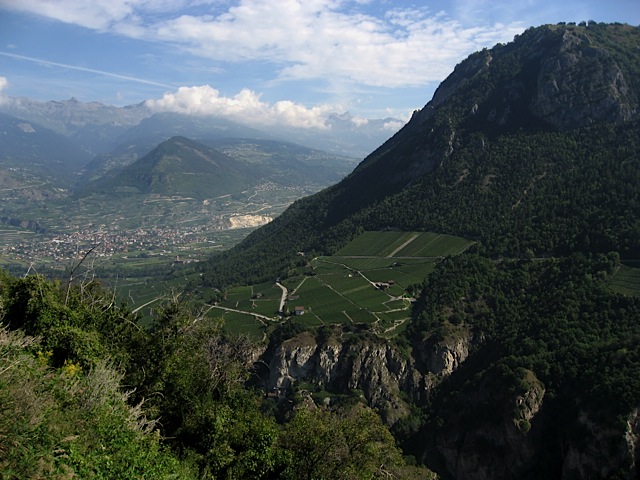 Looking down into the valley at the stage 5 start and finish in Sion along the Rhône River. The mountains overlooking Sion on the other side include the two cat 1 climbs (1450m el) which will be featured early in the stage. (photo: steephill.tv) |