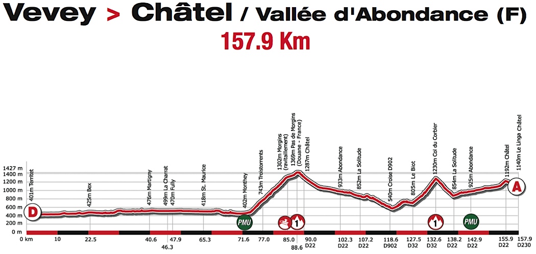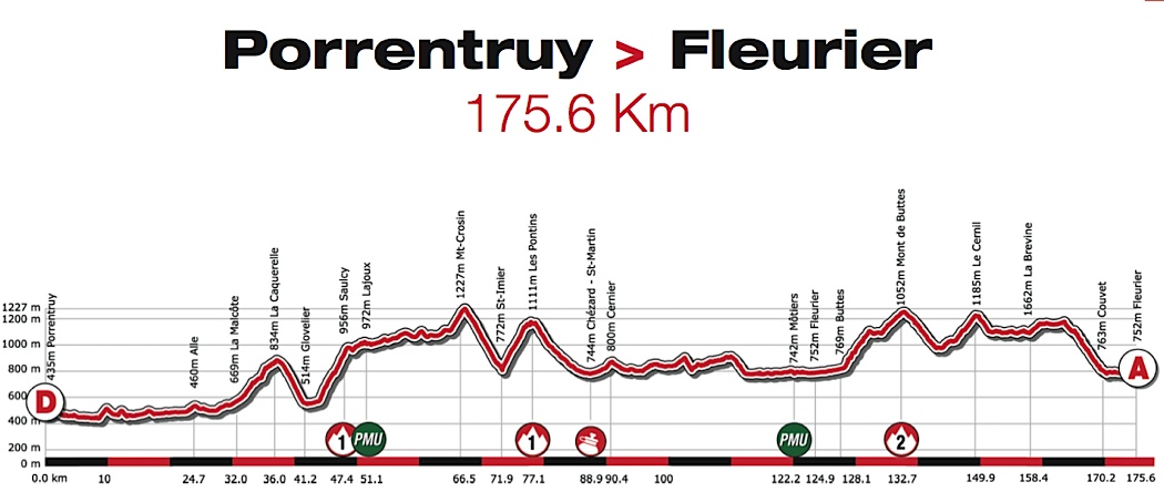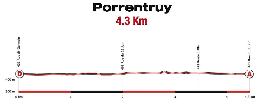 As usual, the race starts with a prologue, but this year it will start in Porrentruy on April 27th. Usually, Geneva or Lausanne hosts the start. There is also an individual time-trial on Stage 4 around Moudon of an undetermined length. The race will enter France twice, one during the prologue and then again with the mountaintop finish on Stage 5 at Châtel (near Morzine). The following day is the final and Queen Stage on May 3rd with a "very hilly" route around Sion.