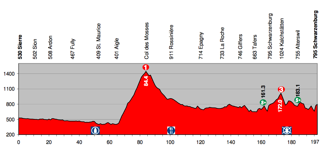(We are looking for translations in ALL other languages. Please submit your translation with the stage no. and language in the subject title.) June 14 update: Stage 3 moves into the old Romandie (French) part of Switzerland. From yesterday's finish and today's start in Sierre, the peloton will continue through the valley following it west and then north. At Aigle, home to the UCI headquarters, the race will head east, up and over the cat 1 Col des Mosses which gains about 1000m in 15km. Like yesterday, the big climb is in the first half of the race so it will not be a big factor. After a long descent down to Chateau d'Oex, there is about 60 km of lumpy cycling with a category 3 climb positioned 25 km from the finish in Schwarzenburg. There will be a stiff 1 km climb with an average grade of 11% just 1 km from the line. The last km is pretty much flat. — Steve