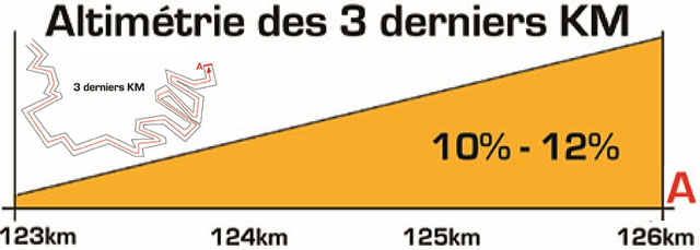 ) goes off without a hitch. Alejandro Valverde is best placed among those who are expected to contest the cat 1 climb and steep finish. (See profile of the last 3 km above). See the race summary links (right) for stage map, profile and timetable.