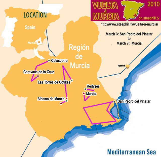 March 5 update: Due largely to the top 30 riders of Friday's queen stage finishing in the same time, nothing has been decided after three stages so Saturday's Stage 4 straight and flat 22 km time-trial west of Alhama de Murcia will decide this hilly stage race. Since the GC will not change on the final flat stage, an excellent performance on the TT bike Saturday will likely make the TT winner the GC winner as well unless you are Dave Zabriskie of Garmin and lost 8+ minutes for some reason on stage 4. Perhaps he was saving himself for a good TT performance.