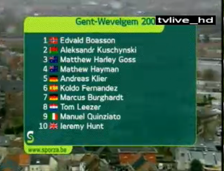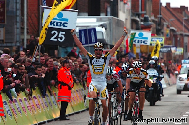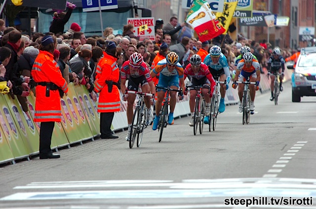 1 Bernhard Eisel (Team HTC-Columbia) 219 km in 5h16"21" 2 Sep Vanmarcke (Topsport) 3 Philippe Gilbert (Omega Pharma-Lotto) 4 George Hincapie (BMC) 5 Daniel Oss (Liquigas) + 0'02" 6 Jurgen Roelandts (Omega Pharma-Lotto) + 0'07" 7 Maxim Iglinskiy (Astana) + 0'51" 8 Matti Breschel (Saxo Bank) + 1'01" 9 Tyler Farrar (Garmin-Transitions) 10 Luca Paolini (Acqua e Sapone) 11 Christian Knees (Milram) 12 Oscar Freire (Rabobank)