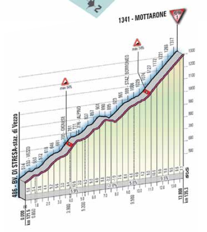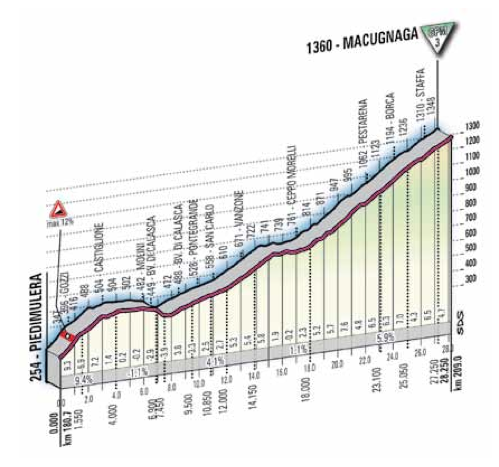 (We are looking for translations in ALL other languages. Please submit your translation with the stage no. and language in the subject title. If you don't see your preview posted within 12 hours then please resend your preview as an attachment if you didn't already do so because we've had problems with some inline character sets like German.) May 26 post: Stage 19 is the seventh of eight mountain stages featuring two categorized climbs in the second half of the stage including a summit finish at Macugnaga, a small alpine village near the border with Switzerland. Macugnaga is making it first appearance in the Giro d'Italia, but its known as a base camp for the second highest peak in Europe, Monte Rosa. The climb to Macugnaga (profile) is listed as being 28 km long with a modest 3.9% average grade. Before we get to the finishing climb, there will first be 100 km of flat cycling as we cross the Lombardy region from east to west and then we hit the Mottarone which is steeper than the finishing the climb. The cat 1 Mottarone (profile) is 13.8 km long averaging 6.2% with a maximum grade of 14%. Gilberto Simoni locked up his 2001 Giro d'Italia win by winning the summit finish on Mottarone by more than two minutes. This year however, there is still 70 km of racing left after we hit the top. There is a tricky descent and then about 20 km of flat cycling before we start the long gradual climb to the finish in Macugnaga.
