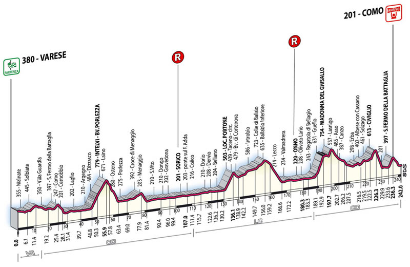 The Course The Giro di Lombardia sets out from Varese over uneven terrain and after 25 kilometers of racing, the course climbs the San Fermo della Battaglia for the first time and passes through the finish at Como. After passing through Como, the course heads northeast. A 9 kilometer climb to Intelvi arrives at kilometer 46 before the course descends to Portezza. The Giro di Lombardia runs along the Swiss border not far from Lugano and passes along the eastern bank of the Lago di Lugano. After hopping over the brief bump of the Croce di Menaggio, the riders begin a 50 kilometer stretch of mostly flat racing and pass through Dongo, Sorico, and Dervio. At Sorico, the Giro di Lombardia reaches the tip of the clover leaf, and its furthest point from Como. Heading southwest now, La Foglie Morte follows an uneven trace along Lake Como, passing through Dervio, Taceno, and Lecco. The terrain turns bumpy at kilometer 130, where there is a six kilometer climb to Portone before a short descent to Taceno. About seven kilometers of gradual climbing follow the town ofTaceno until the summit of the Colle di Balisio at kilometer 156. From there, it’s a 10 kilometer descent which passes through Lecco and comes to rest in Valmadreta. But this is all prologue.