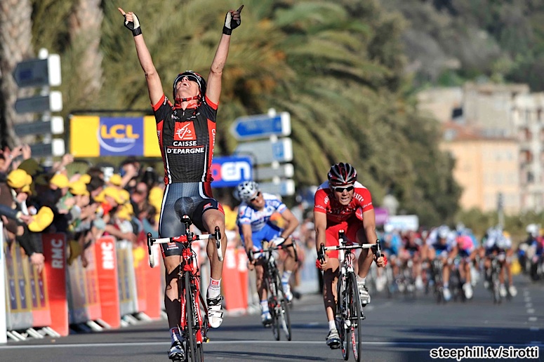 March 12 update: The final stage around Nice is always spectacular with thrilling bike racing. Check out the new 3D Flyovers below for more on the climbs. In particular, see if you can count the number of private swimming pools during the Col d'Eze flyover. In total, there are five categorized climbs. Tony Martin has a 36s lead on Andreas Kloden which should be safe barring a crash by the man in Yellow. The stage finishes along the white sands of the Mediterranean on the Promenade des Anglaises. The final kilometers are flat, and on occasion, the stage ends with a desperate chase to the line such as when Luis Leon Sanchez (photo above) won after a solo descent of Col d'Eze in 2008. — Steve