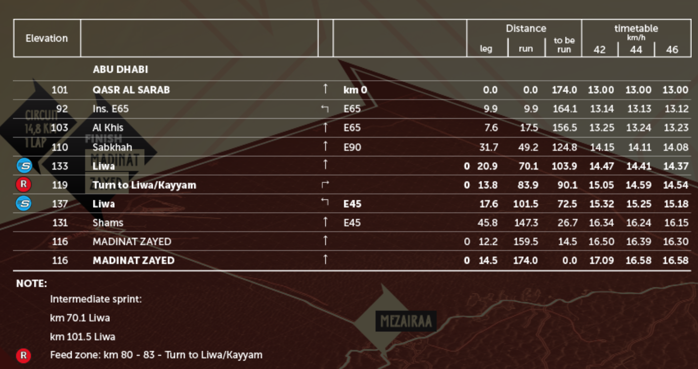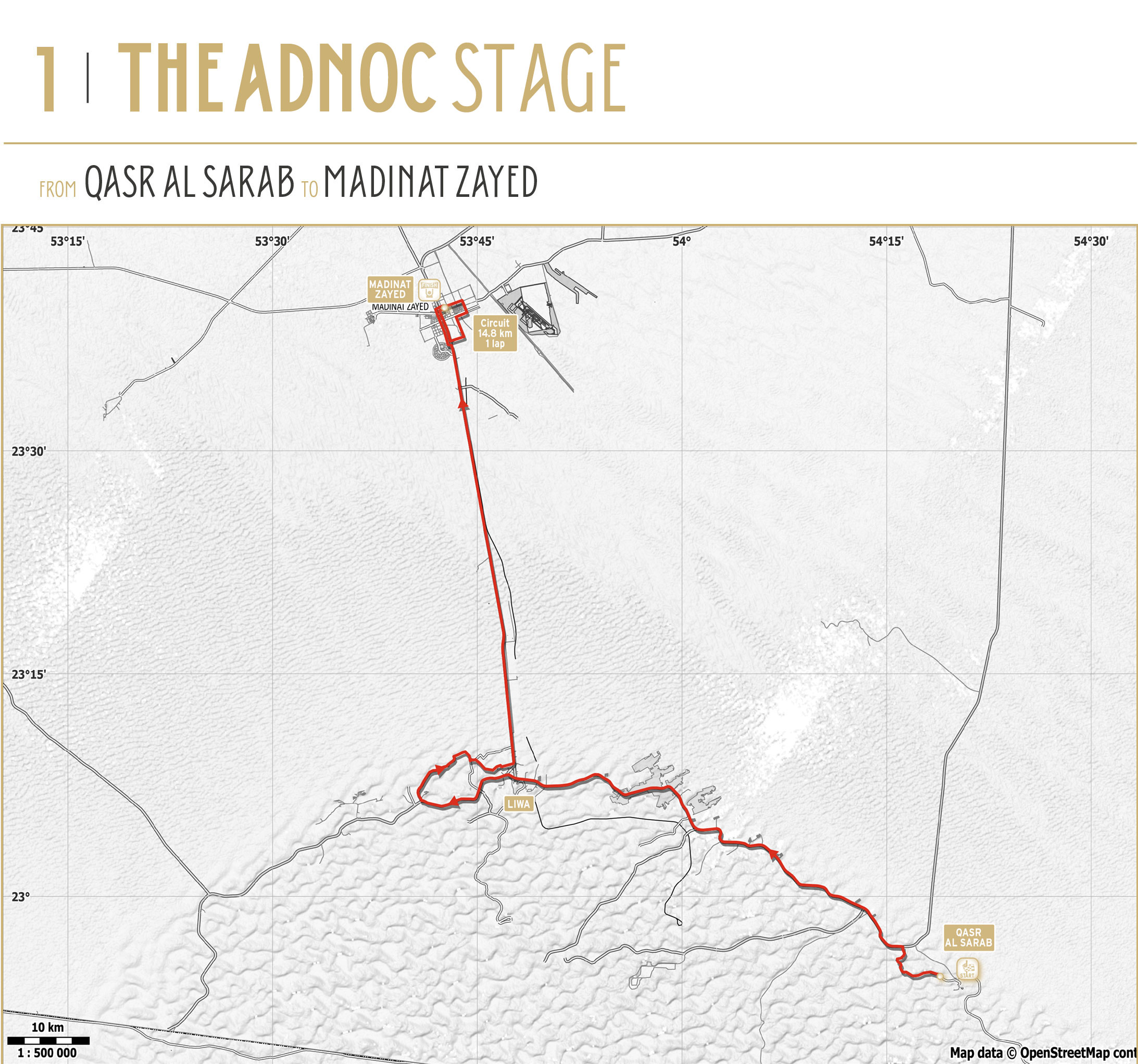 From the organizer: The entire stage takes place in the stunning Rub al Khali desert, part of Abu Dhabi’s Western Region. Starting among the red sand dunes that surround the beautiful Qasr Al Sarab Resort, the undulating race route accrues around 1,200m of vertical climbing. The riders will trace a ring around Liwa and the nearby oasis, passing through the town twice. The riders then head north along straight roads for 55km, with the slightest of downhill gradients, as far as the town of Madinat Zayed. After the first crossing of the finish line, the peloton then enters a final 15km loop, to be ridden just once. A mass sprint is expected, although the desert winds could influence the outcome.