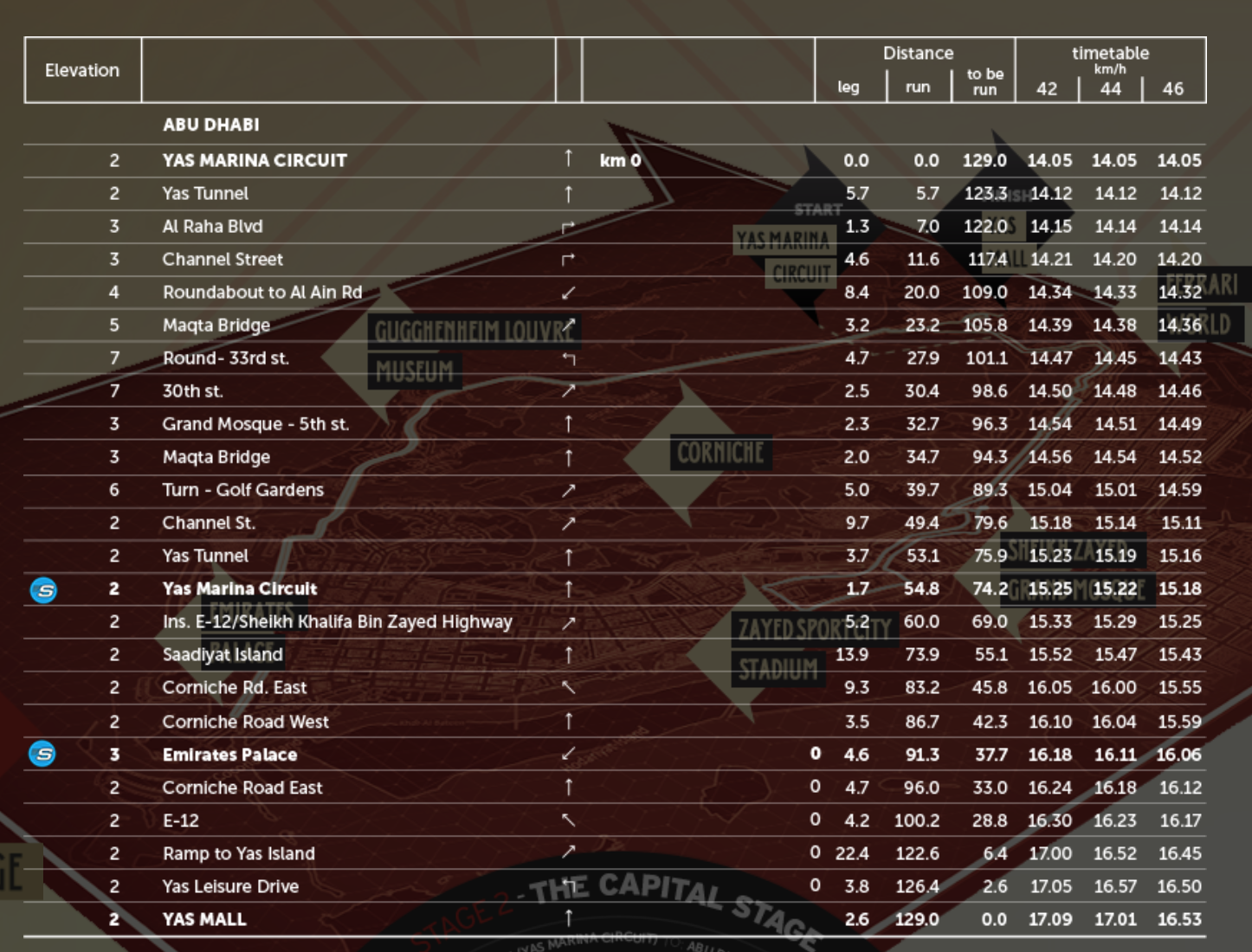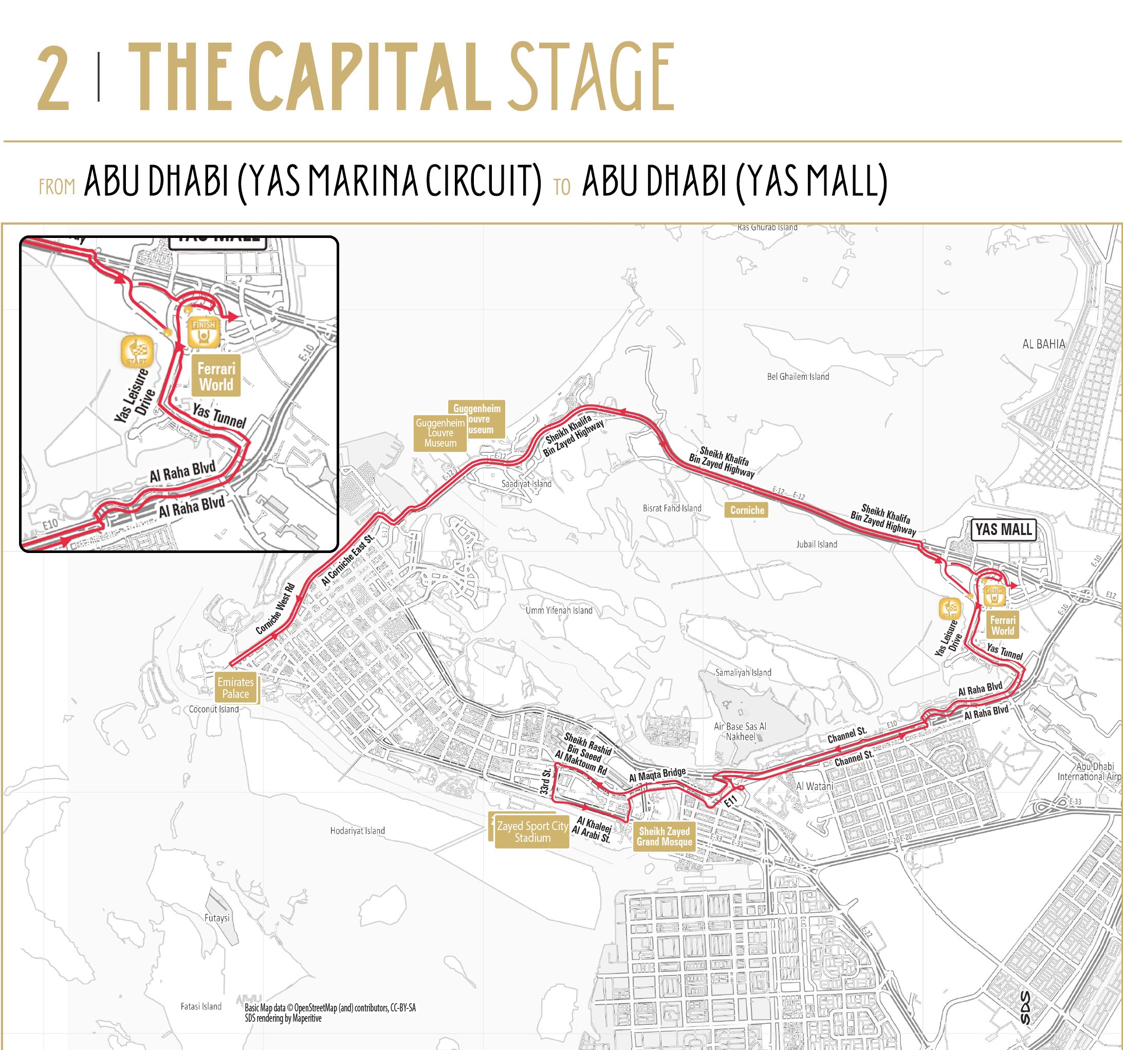 From the race organizer: A flat stage across the city, starting at the Yas Marina Circuit and heading towards the southern part of the city along wide and mostly straight roads. After the Sheikh Zayed Grand Mosque and the Exhibition Hall, the peloton turns back on itself, returning to Yas Island, then follows the Corniche until the Emirates Palace. There the riders will face a U-turn, cycling again alongside the Corniche until Yas Island, where the finish line is positioned next to the Yas Mall. Again, a mass sprint is expected.