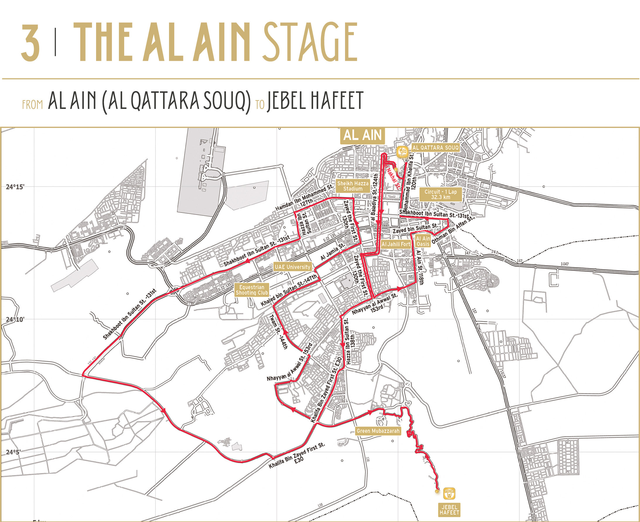From the race organizer: The toughest stage of the inaugural Abu Dhabi Tour. Starting from Al Qattara Souq, the first 33km follow a series of broad, straight roads, then the peloton will trace a wide circle around the city, crossing the Green Mubazzarah oasis before starting the final climb. 11 km long, the Jebel Hafeet ascent reaches an altitude of 1,000m on gradients that average 7.5% and touch 12% on the lower slopes. The climb, on wide, well surfaced roads and with long, sweeping bends, eases into a short descent with 1.5km to go, before resuming a shallow climb to the finish line. The final climb will, in all probability, decide the General Classification.