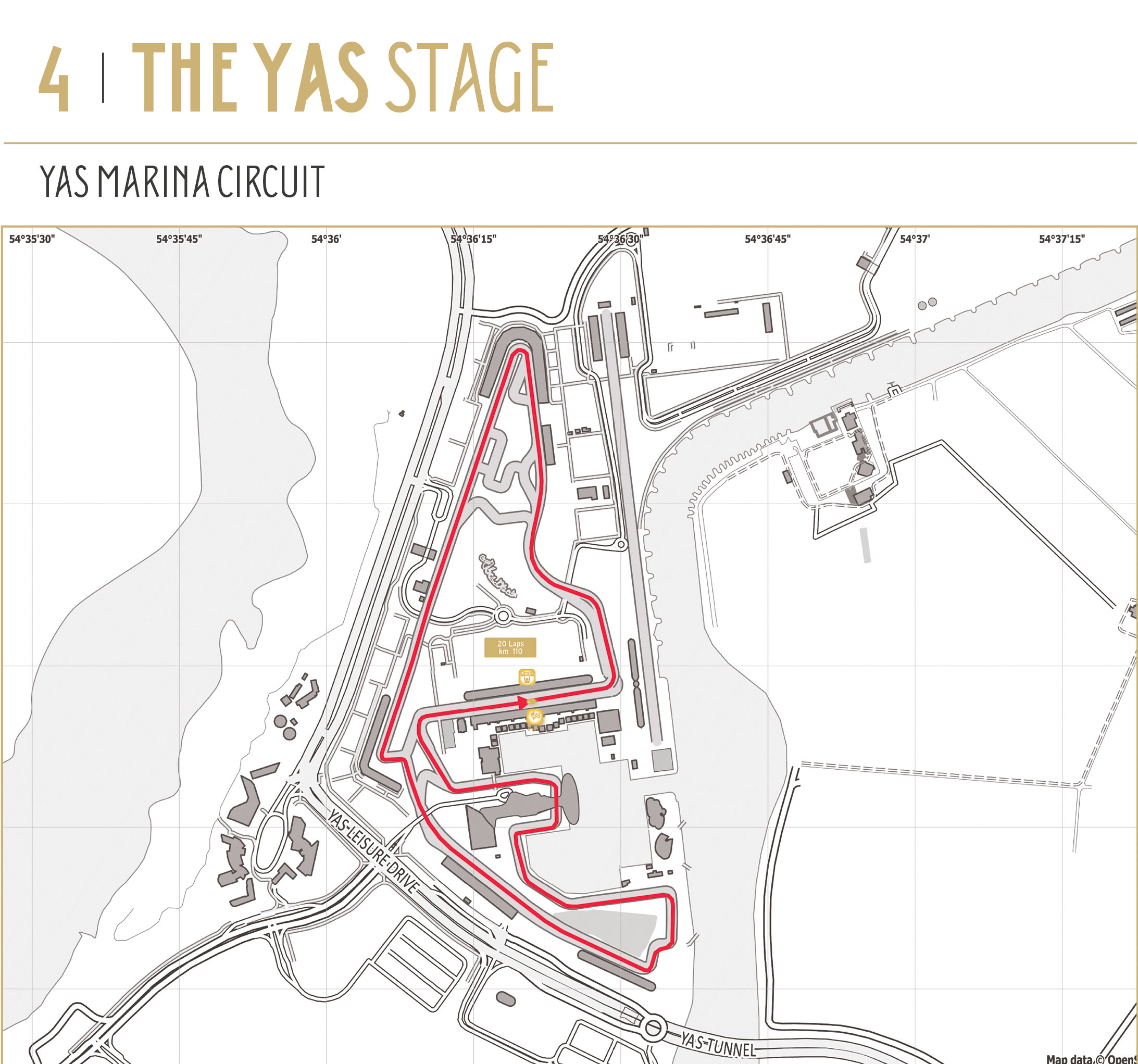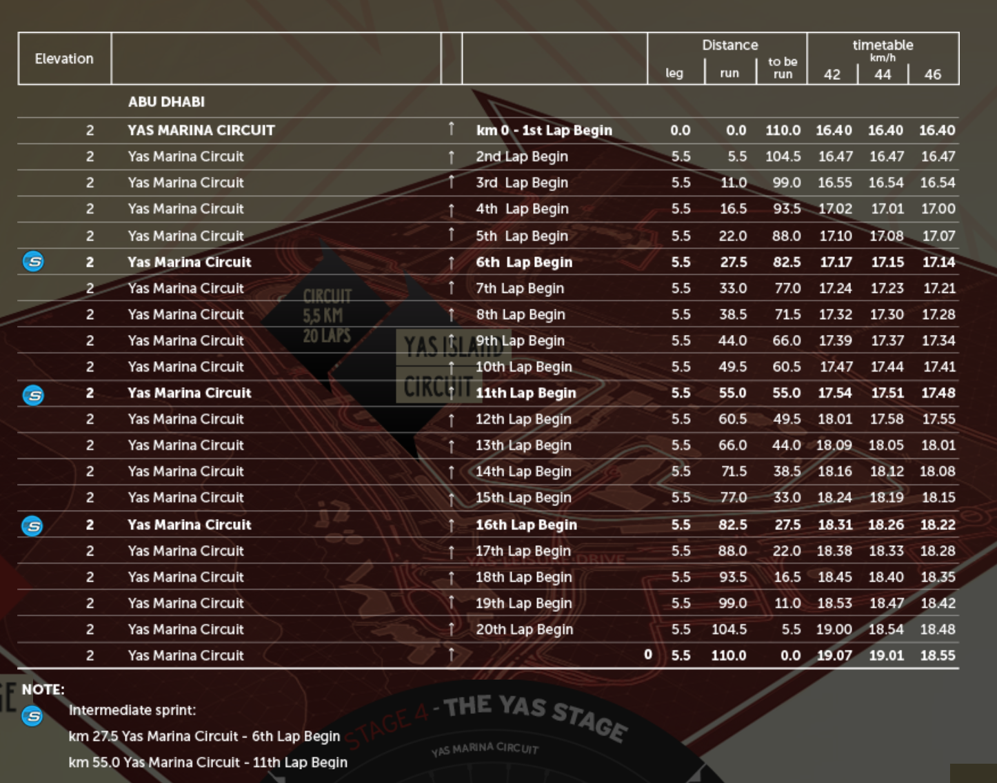 From the race organizer: The entire stage takes place at night on the Yas Marina Circuit. 110km at night under the floodlights of the F1 Circuit. The peloton will complete 20 laps (5.5km each) culminating in the last Abu Dhabi Tour sprint. The circuit is wide and the surface is in impeccable condition.