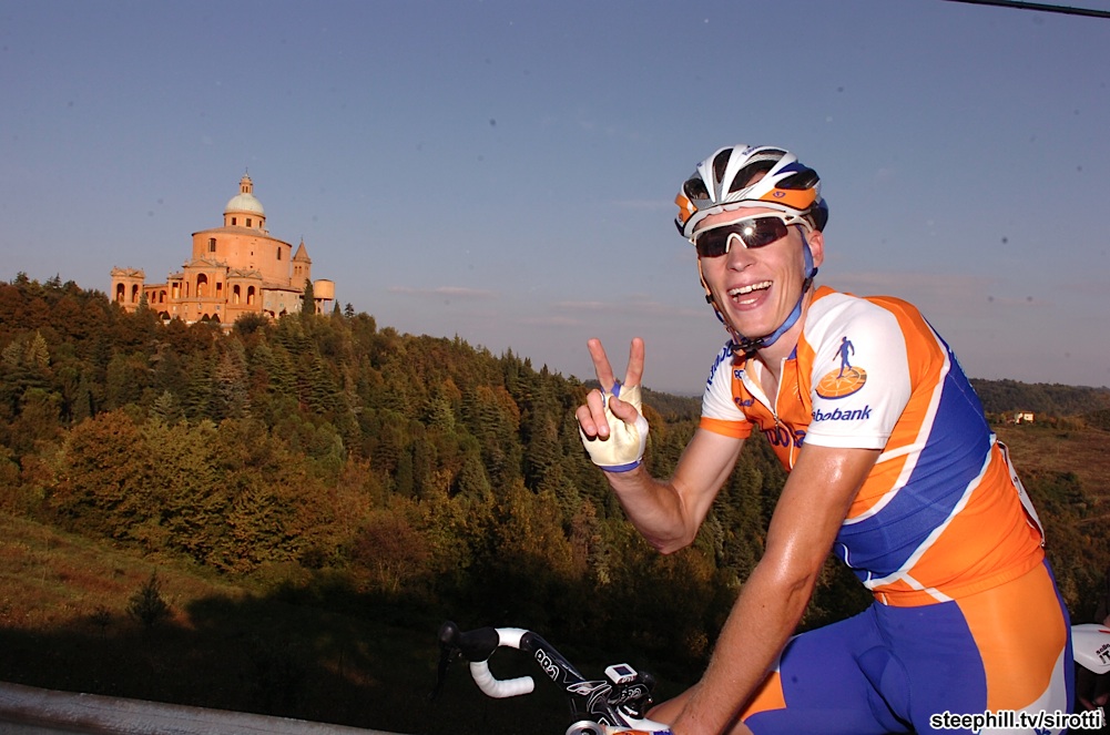2009 winner Robert Gesink stopped for a photo-op with Our lady of the Mountain during his victory lap