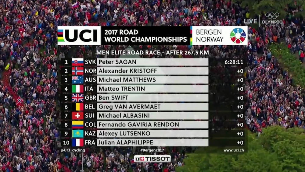 Men's ITT finish line on top of Mt. Fløyen. It doesn't get more spectacular than this #Bergen2017 pic.twitter.com/iZ3KydppXW