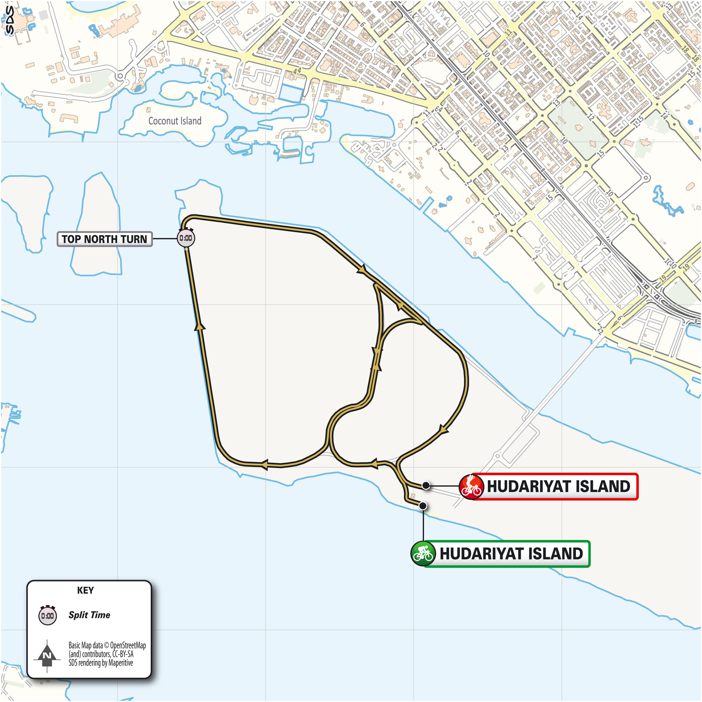 February 22 update: The Team Time Trial will be raced at Al Hudayriat Island, a brand new (man-made) leisure and entertainment destination. The stage has a very fast course combining the two different cycle path loops of 5 and 10km, with straights punctuated only by two U-turns around km 3. The road is perfectly flat, wide and with wide-angle turns that will enable the teams to keep a very high speed: expected speed averages are over 55km/h. The island is also very exposed to ocean winds.