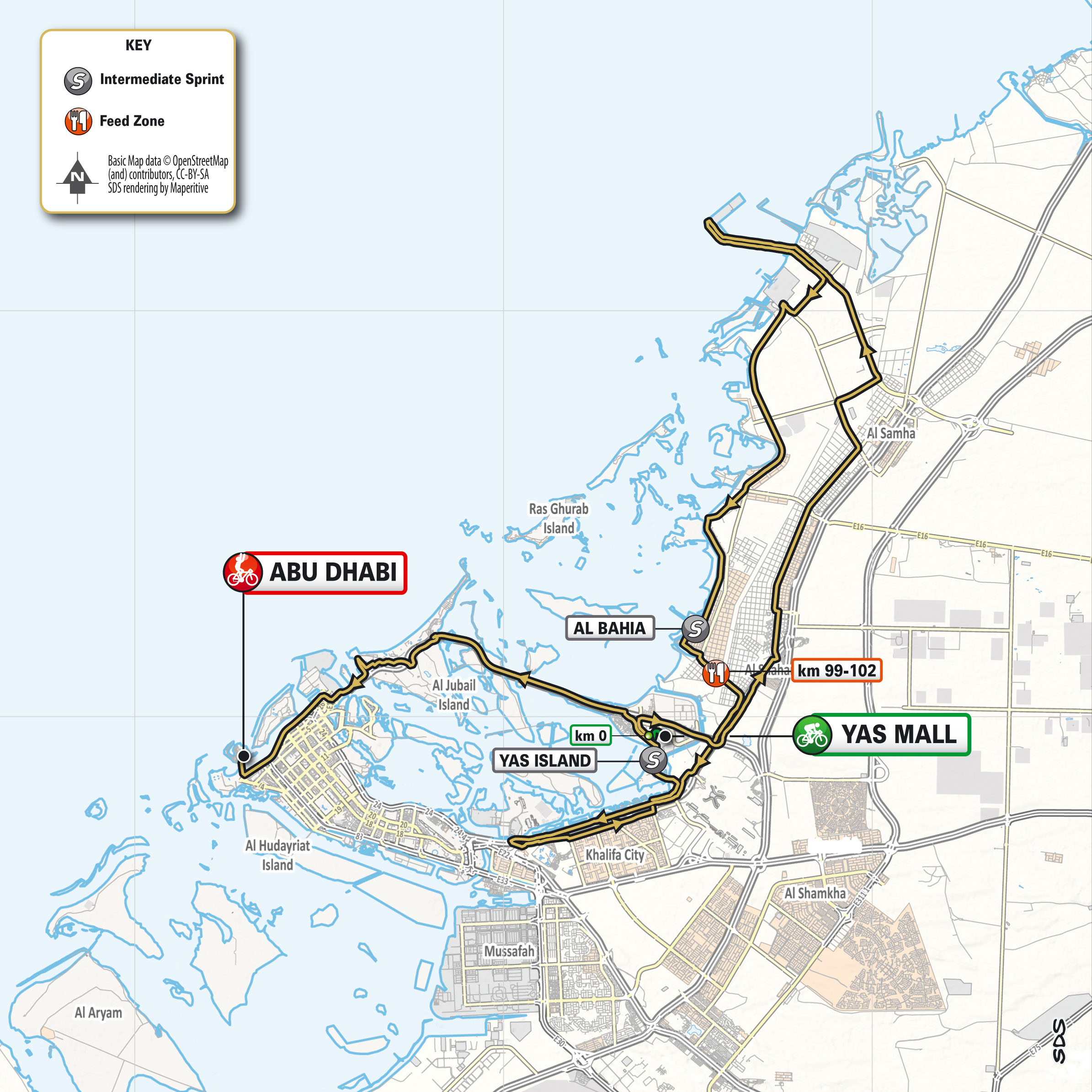 February 24 update: Raced around the streets of the city of Abu Dhabi, Stage 2 follows one of the classic Abu Dhabi Tour stages. Starting from Yas Mall, the first part of the route in the northeast part of the city heads towards Khalifa Port, where there is a U-turn on the pier. The riders return to the city along Channel Street and then they ride through from Yas Island to Saadiyat Island, past the Louvre Abu Dhabi and the Corniche until the reaching the finish line at Abu Dhabi Breakwater for what is expected to be the first sprint of the race. The final 5km are all on wide roads with gentle semi-curves that lead to the final straight on tarmac. — rcs