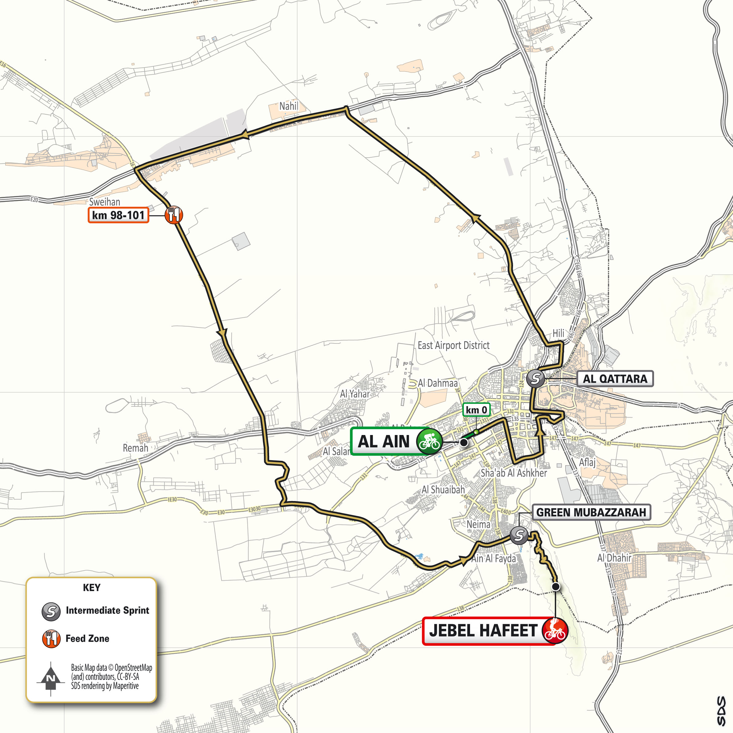 February 25 update: The first of the UAE Tour’s two mountain stages follows another successful course familiar from the Abu Dhabi Tour. The route around Al Ain takes in many of the landmarks – including Al Ain Zoo, Al Qattara, Al Hili and Al Ain Oasis – goes up to Green Mubazzarah where the final climb of Jebel Hafeet begins, with its 10km that will make the first real selection of the race. The final climb goes through a series of wide hairpins on a three-lane carriageway. Gradient around 8-9% with a maximum of 11% at 3km to go. Very short descent on the final km just before the last climb. Final straight on tarmac. - rcs