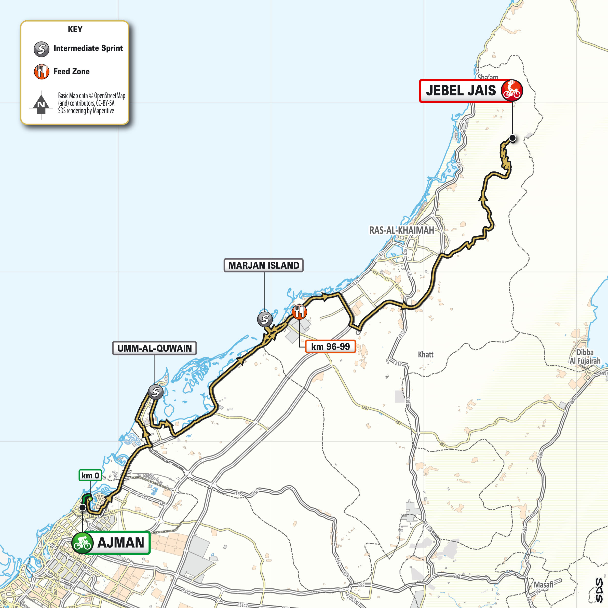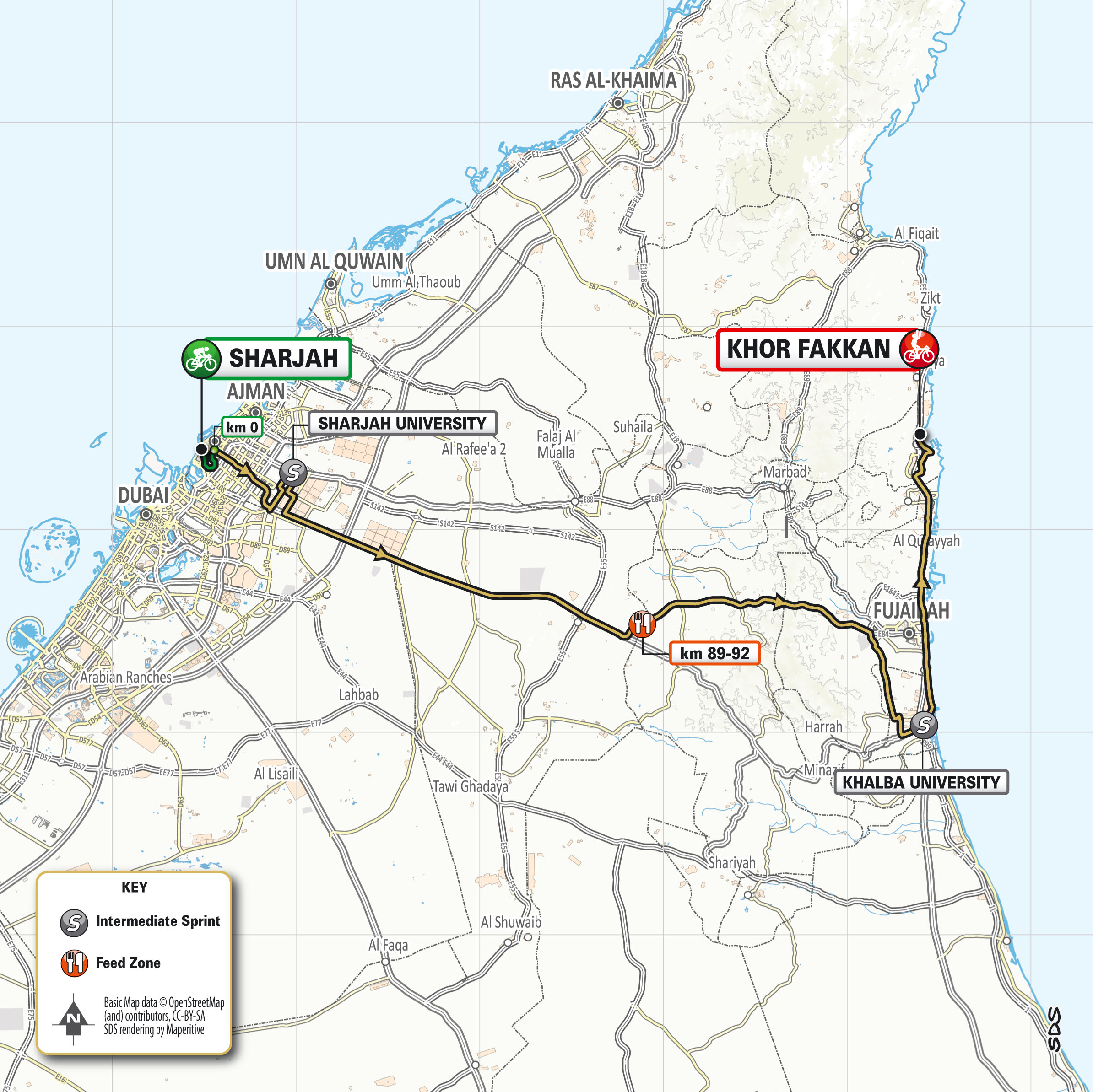 February 27 update: This stage, that connects the Arabian Gulf with the Indian Ocean (Gulf of Oman), is another opportunity for the sprinters. After crossing the desert between the University of Sharjah and the University of Khalba, the route follows the coast north through Fujairah, up to the finish line in Khor Fakkan, where a bunch sprint is expected. The final 5km are on ample roads, evenly surfaced and with divided carriageways. The final 3km feature several roundabouts, the last of which leads on to the 8m wide, tarmac final straight. — rcs