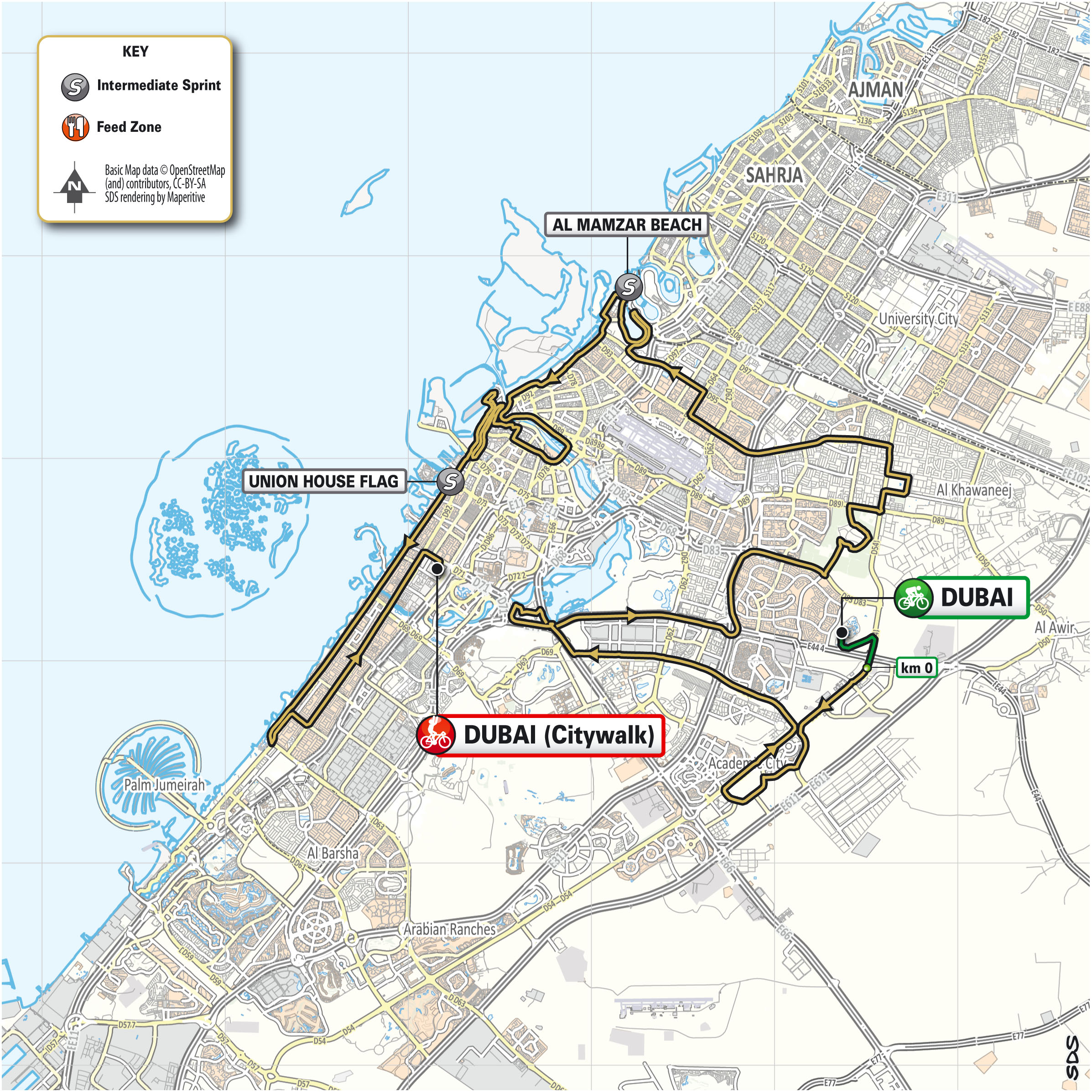 March 1 update: The UAE Tour’s final showdown is through the streets of Dubai, based closely on one of the most popular features of the Dubai Tour. After departure from the Dubai Safari Park the route then grafts on to the familiar course through the Dubai Design District, Mushrif Park, Al Mamzar Beach, Deira, and Rashid Port to reach Jumeirah Road and finish in Citywalk. The final stage is one for the fastest wheels! After leaving Jumeirah Road the route is on wide roads with a final curve at 500m to go, and enters the City Walk, where the finish line is on an 8.5m wide road with square cobblestones. — rcs