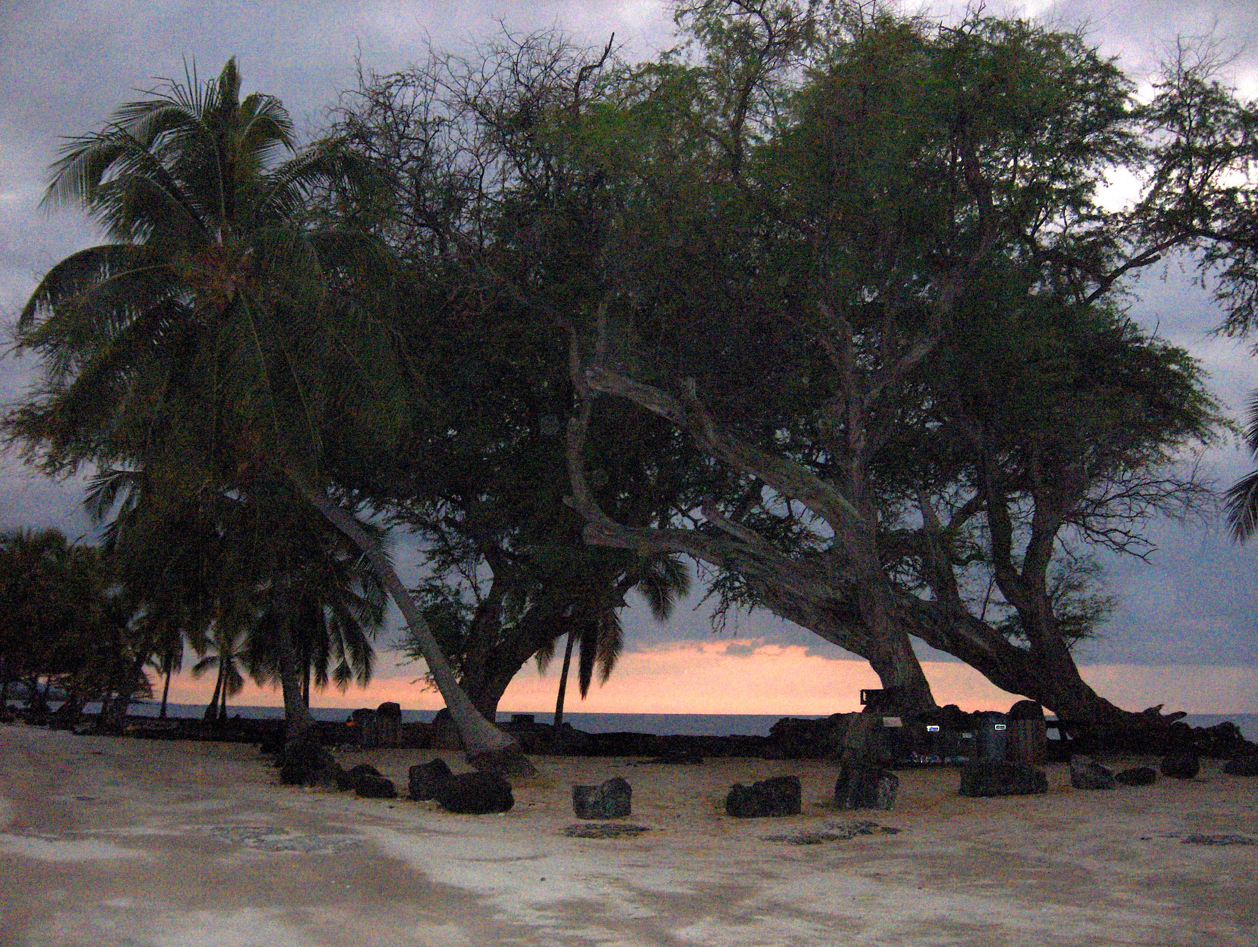 A grainy picture of Pu'uhonua o Honaunau National Historical Park at dusk