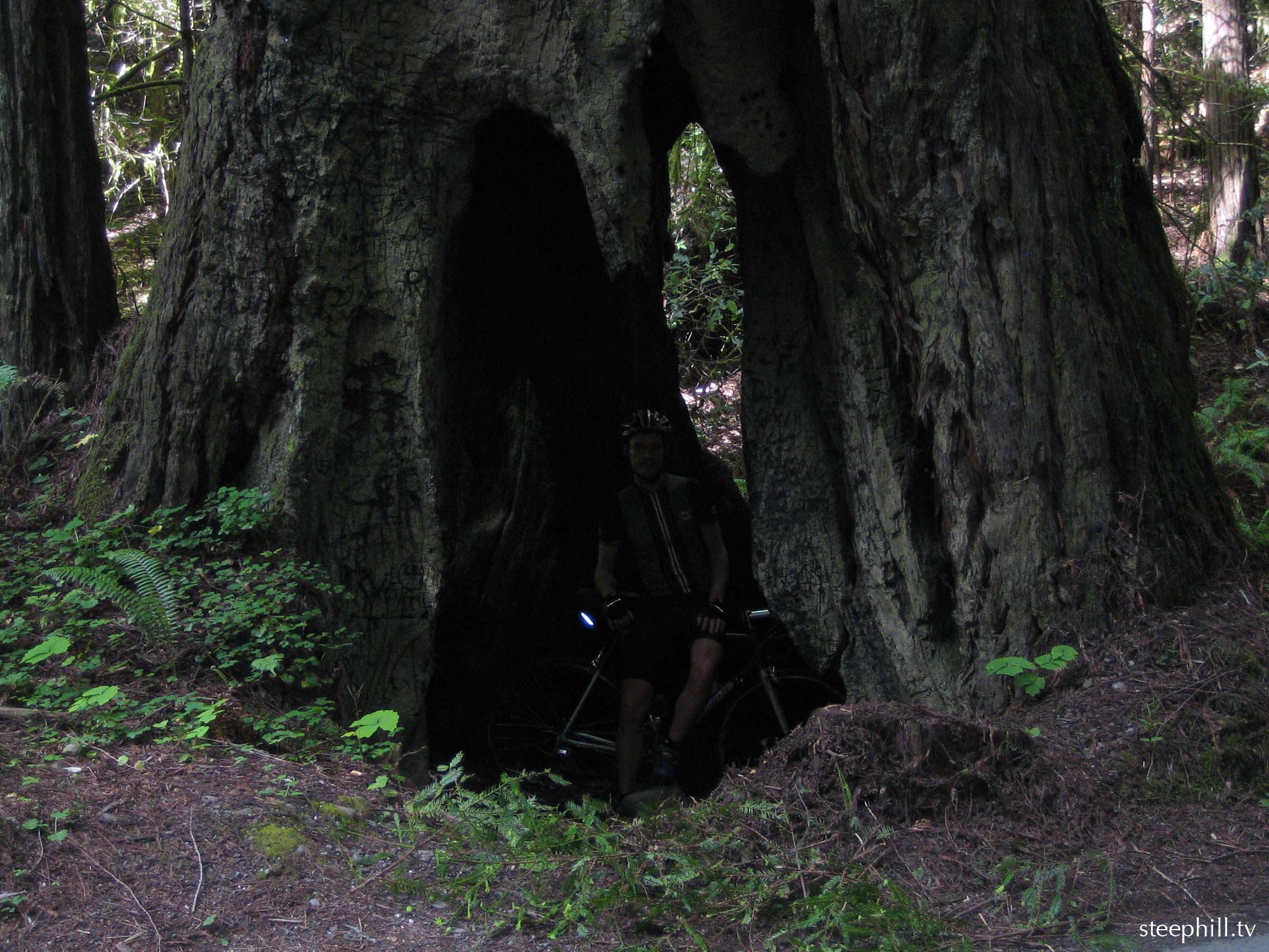 Redwoods can withstand major internal damage since all nutrients move up under the bark