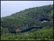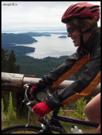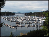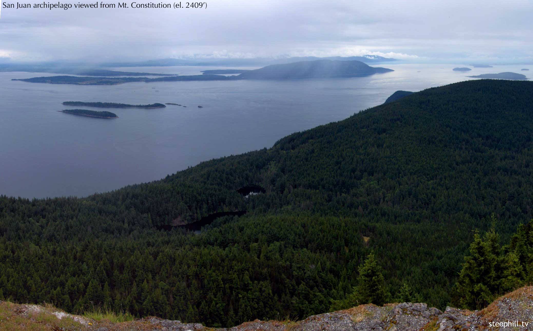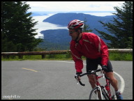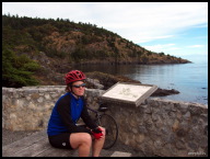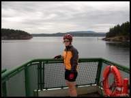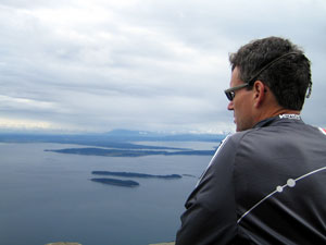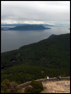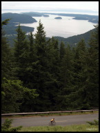 We found the best island for our type of cycling was Orcas Island where the terrain featured more hilly, shoreline roads. There was even a very challenging 6 mile switchback climb through Moran State Park going from sea-level all the way to the top of Mt. Constitution (el. 2,409') with about 1550 ft of climbing in a difficult 3 mile stretch to Little Summit. Crunching the numbers, that tough 3 mile section works out to an average grade of 10%... guaranteed to test anyone's constitution! Mt. Constitution is the highest point in the Islands and apparently offers the best view in the archipelago. A stone observation tower allows visitors to climb high enough above the summit for a 360-degree panoramic view. On a clear day you can, as they say, see forever: Vancouver, Canada to the north, the Cascade Range and Bellingham to the east, the rest of the San Juans and the Gulf Islands, Anacortes and the Olympic Range to the south. Our view wasn't quite that clear (see top & right photos) but the view looking down on the thick evergreen covered archipelago was dramatic enough. Our 50+ mile spider ride of Orcas Island was superb and it exceeded our expectations.
