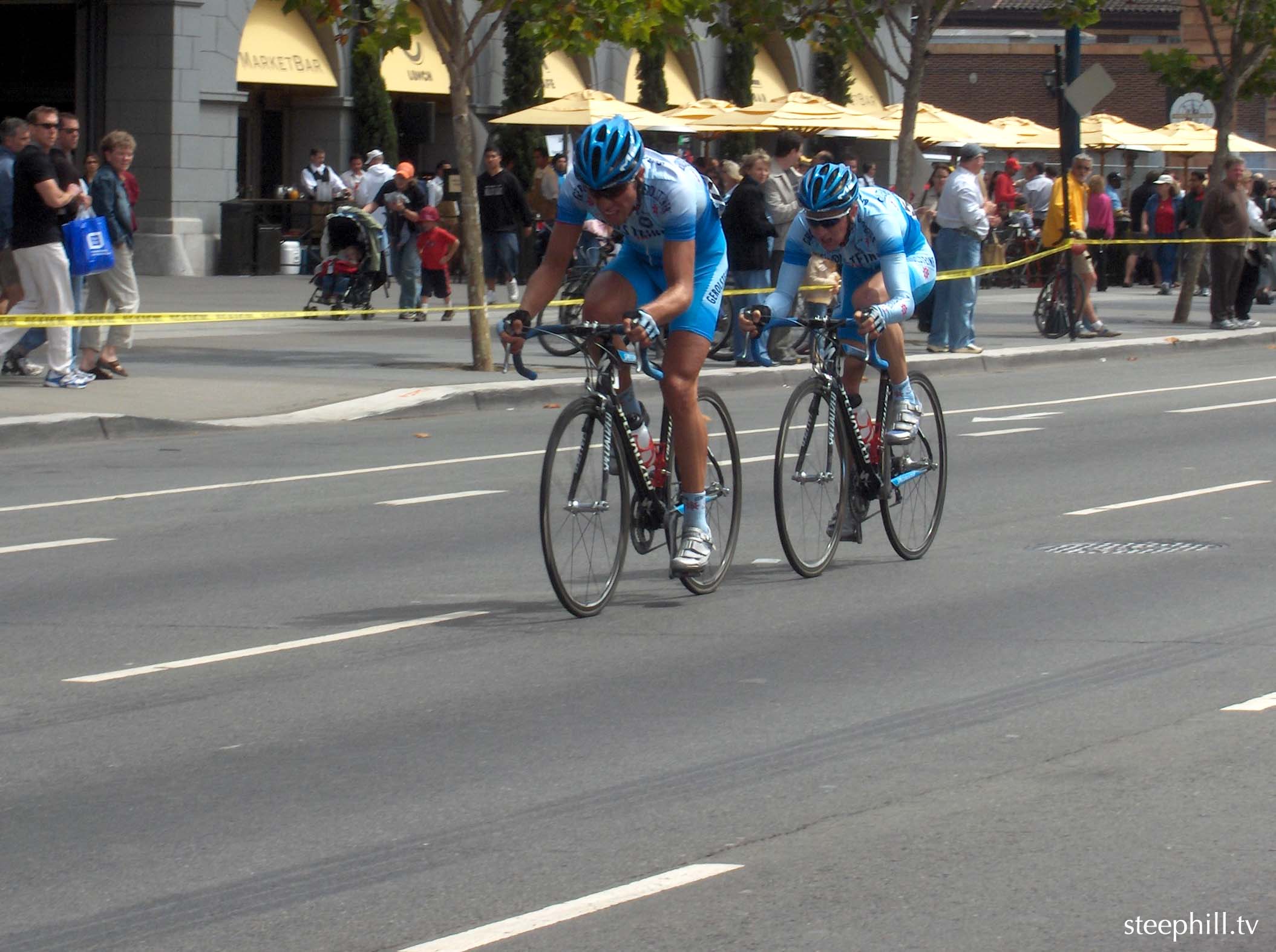 Gerolsteiner's Andrea Moletta driving hard to pull his teammate Fabian Wegmann up to the lead group