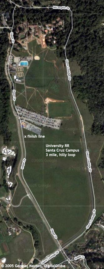 Directions: From Hwy 1 (Mission Street) on the north side of Santa Cruz, take Bay Street north into the hills and onto the campus. Follow the temporary signs to registration at the East Remote Parking Lot on Hagar Drive. Those arriving after 8:00 a.m. will have to take a roundabout route to registration, using the course in the opposite direction of race travel.